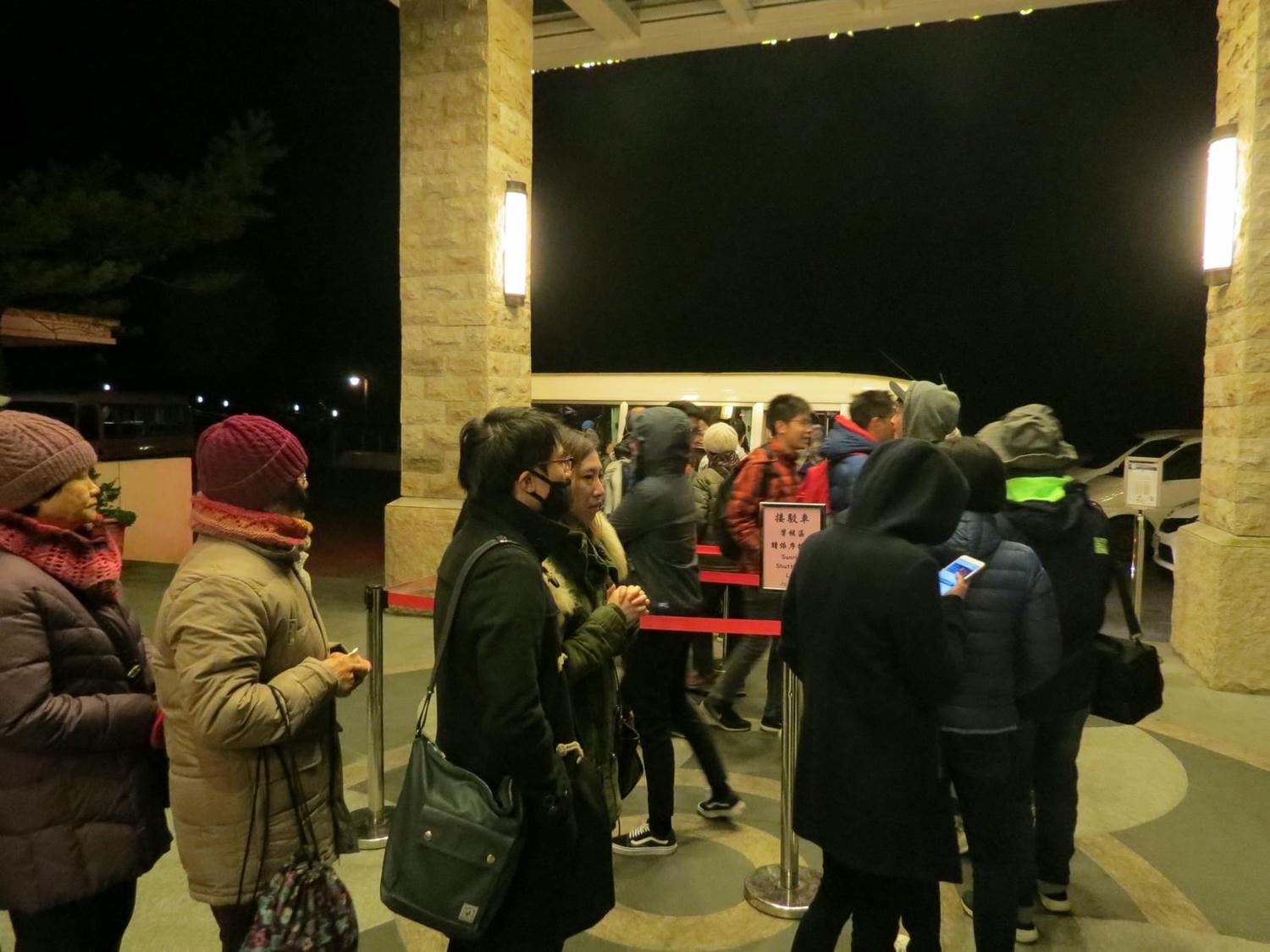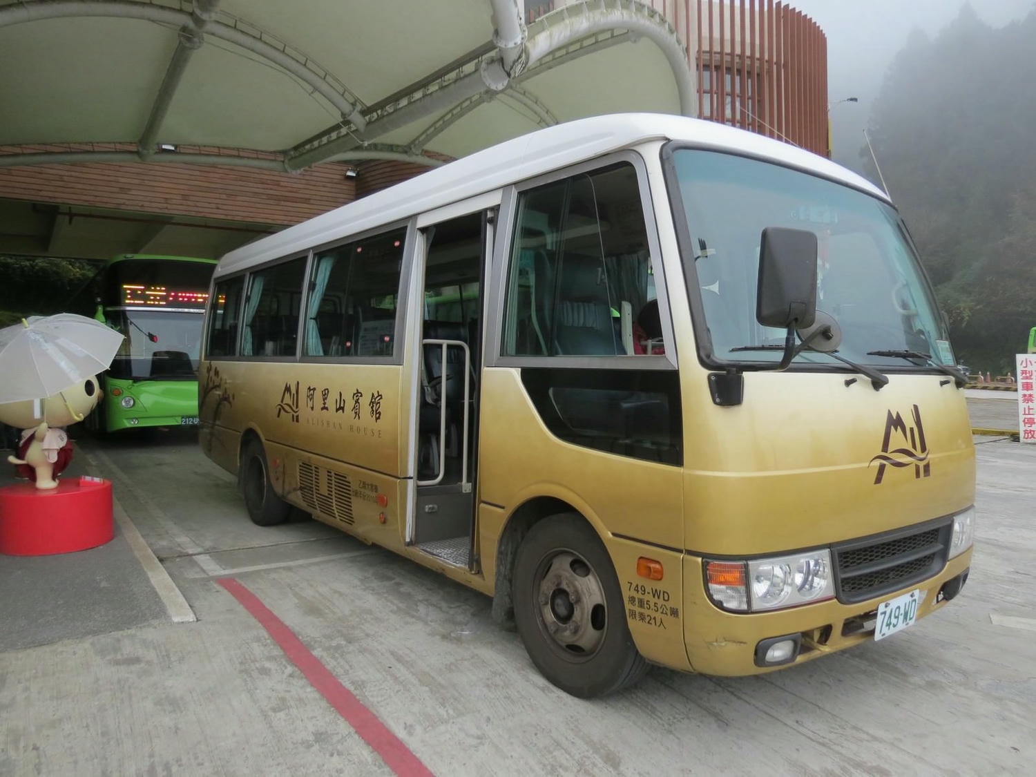 晨喚後,旅客可在大廳外搭乘飯店接駁車到阿里山車站。