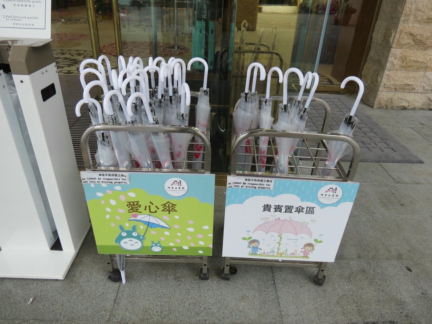 飯店外有愛心傘,提供給忘記帶傘的旅客。