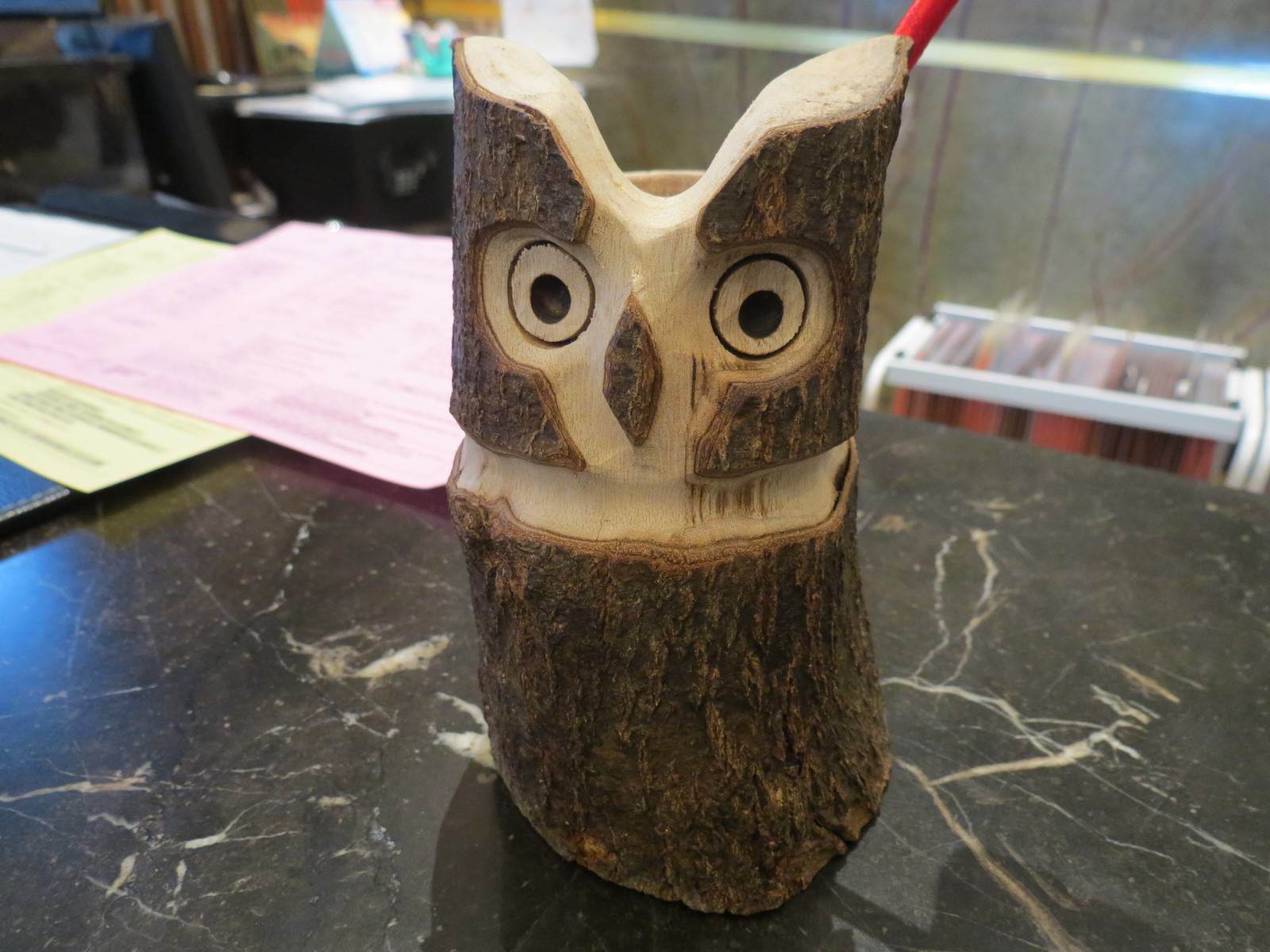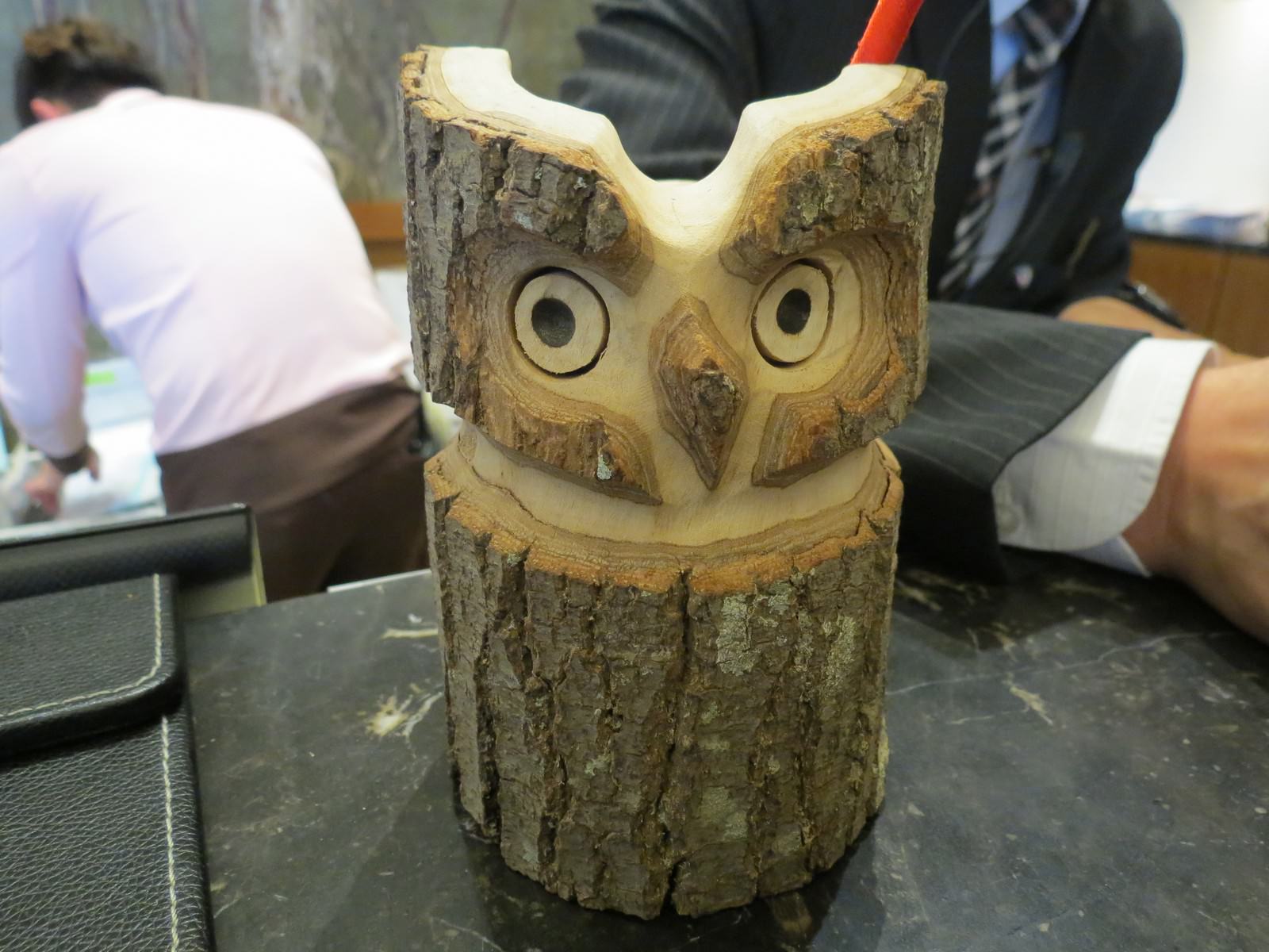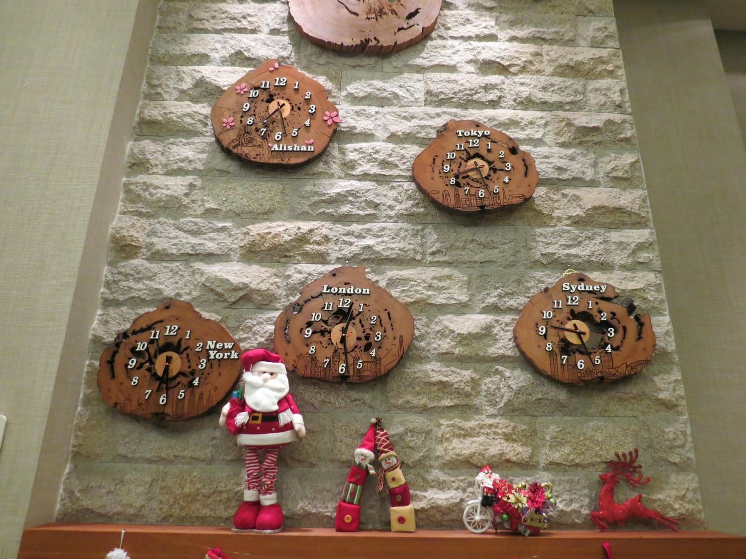 阿里山早年以伐木產業為主,大廳內的世界各地時鐘也以原木切片為造型。
