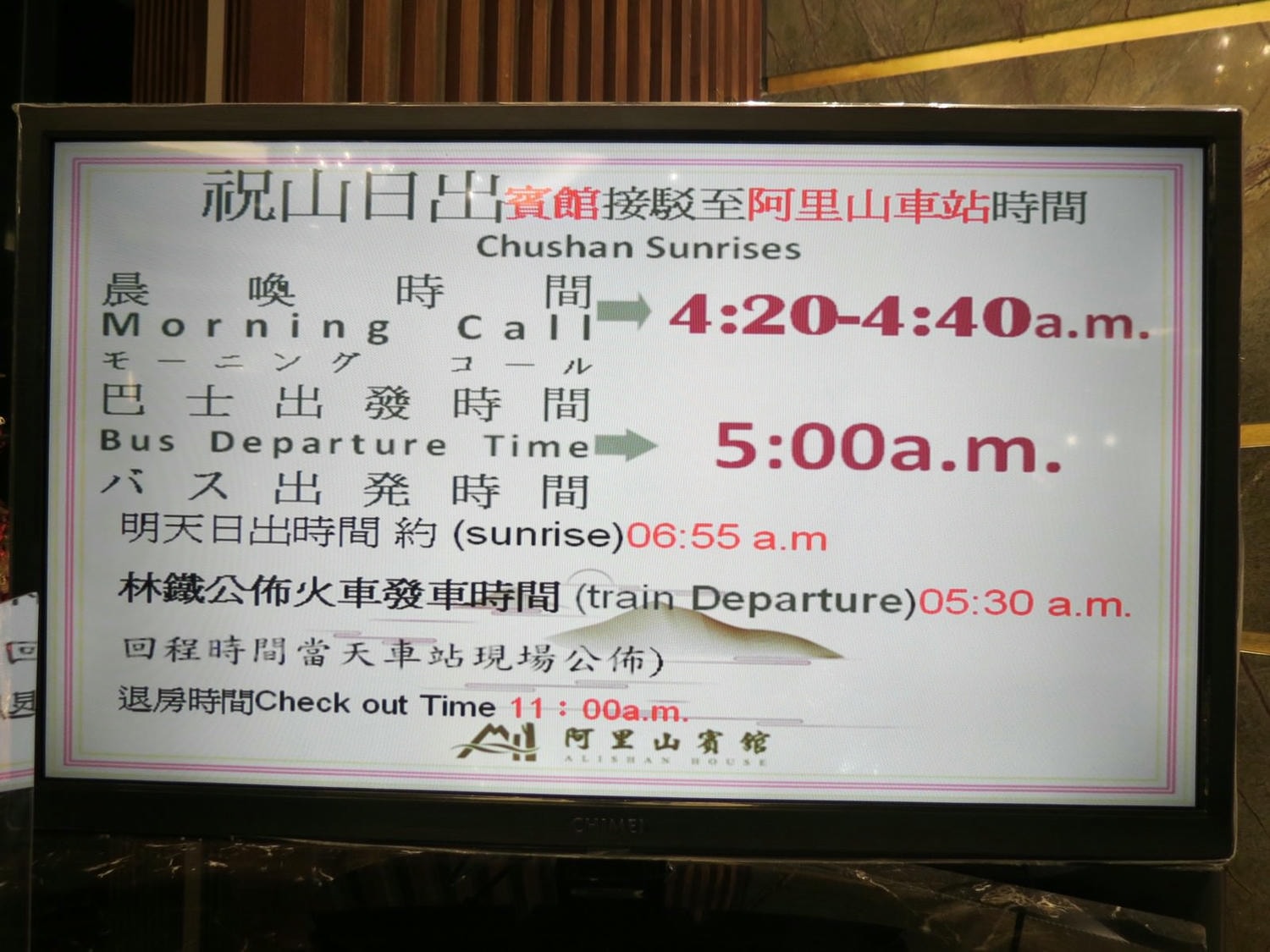 多數人視到阿里山看日出為在台灣必體驗行程之一,飯店有提供代購「看日出小火車」車票的服務,得於 16:00 前訂購(車站售票時間至 16:30),定好票後 19:00 後再到櫃台這取票。櫃台這也會告知日出時間、晨喚時間(Morning Call)、巴士出發時間等資訊。