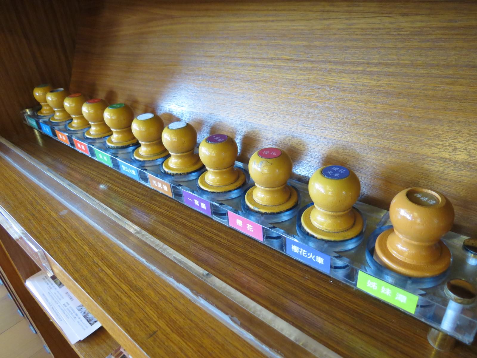 櫃台這有紀念章可以蓋,有姊妹潭、櫻花火車、櫻花、一葉蘭、光武檜、登山火車、森林、晚霞、日出等。