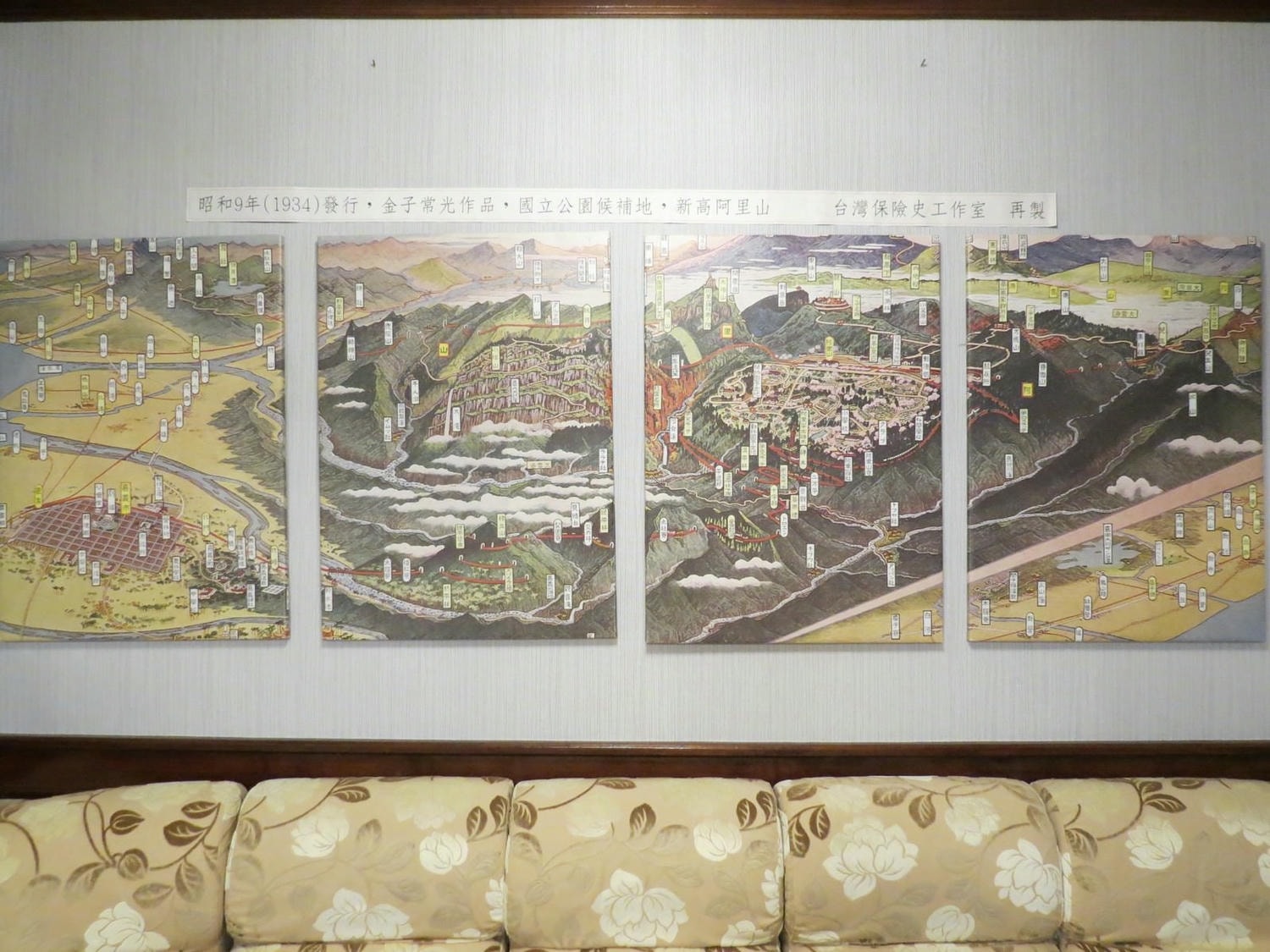 牆上有幅日治時期(昭和9年,西元1934年)阿里山地區再制地圖,像我是搭小火車上來的,對先前鐵路沿途經過的地區皆有在列車上聽得介紹,再來看這地圖就很有意思。