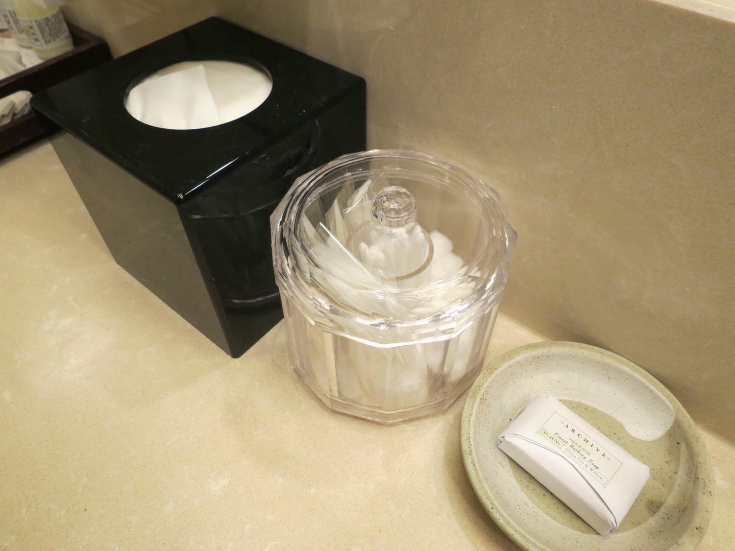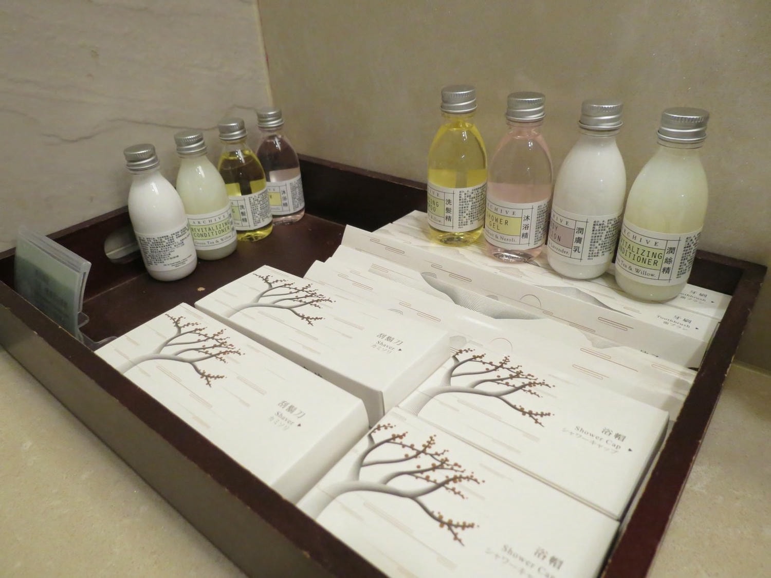 盥洗用具:浴帽、刮鬍刀、牙刷、梳子,小巧可愛的小瓶子裝的是沐浴乳、洗髮乳、潤膚乳、潤濕精。