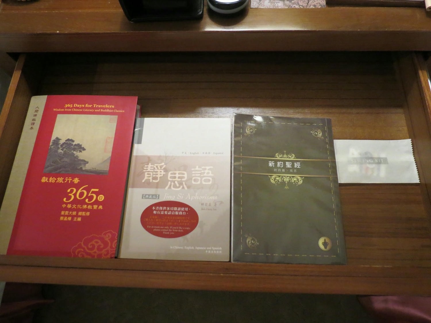 抽屜內有新約聖經、靜思語,國內飯店幾乎都用這兩本來代表宗教信仰讀物,另外還有星雲大師的獻給旅行者365日。