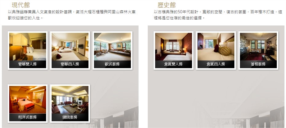 阿里山賓館分為現代館、歷史館,歷史館興建於1913年,在盡可能保留原始建築下翻修,較為古典雅緻,也多是名人居住過的房間,現代館是後來興建,2012年末才啟運,設計較為新穎現代。(畫面翻拍官網)