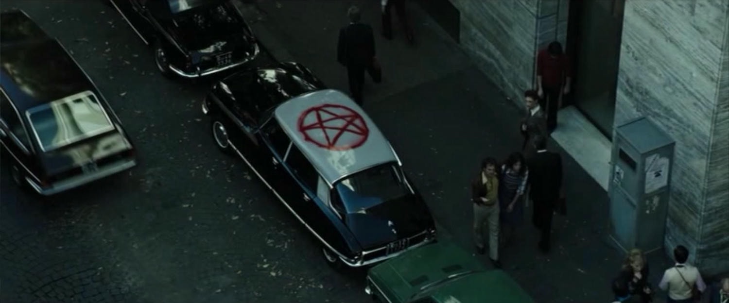 大部分共產主義的標誌都是鐮刀與鎚子,像越南、越南、希臘、智利、埃及、西班牙等國的共產主義政黨,另外五角星也很常使用,義大利重建共產黨就是,劇中這時的背景就是在義大利(從卡賓槍騎兵隊總部走出來能看出來背景)。