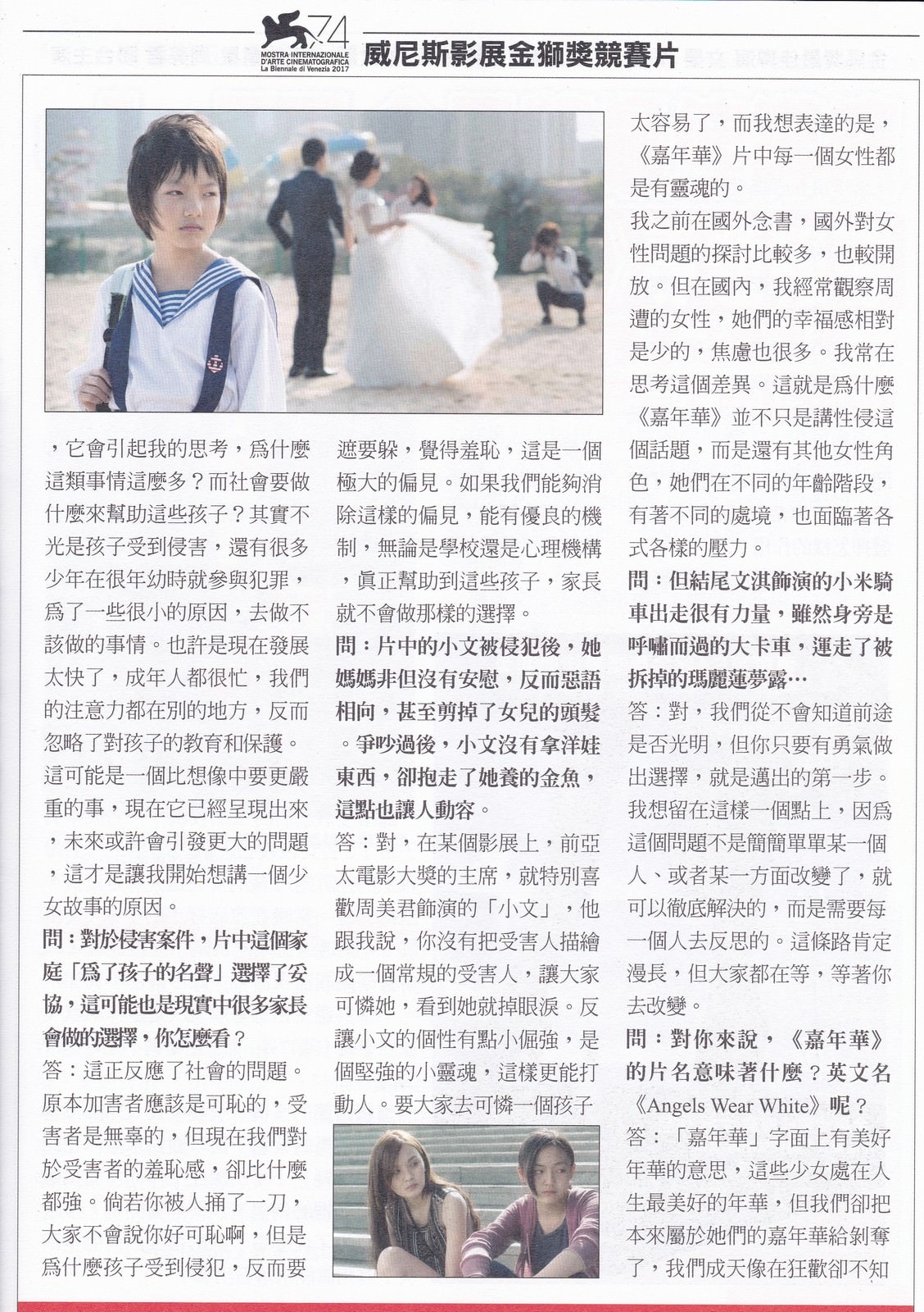 《嘉年華》是中國女導演文晏繼首部長片《水印街》後執導的第二部電影,入圍2017威尼斯影展主競賽,是首位闖進威尼斯主競賽的中國女導演。