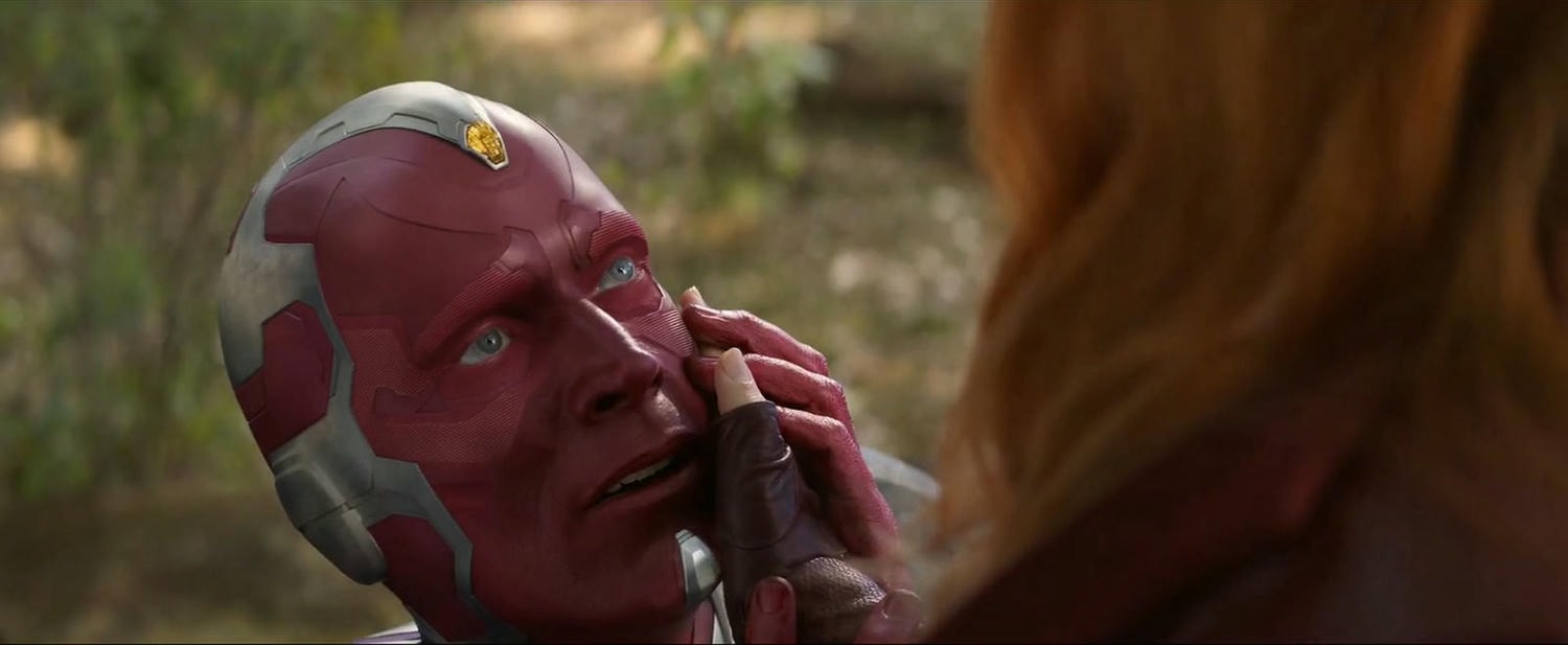 為了不讓無限寶石被搶走,要緋紅女巫直接毀掉他的寶石,但同時也奪走他的生命(雖然他算是機械啦),不過又被薩諾斯用時間回溯救回來,再搶他寶石。