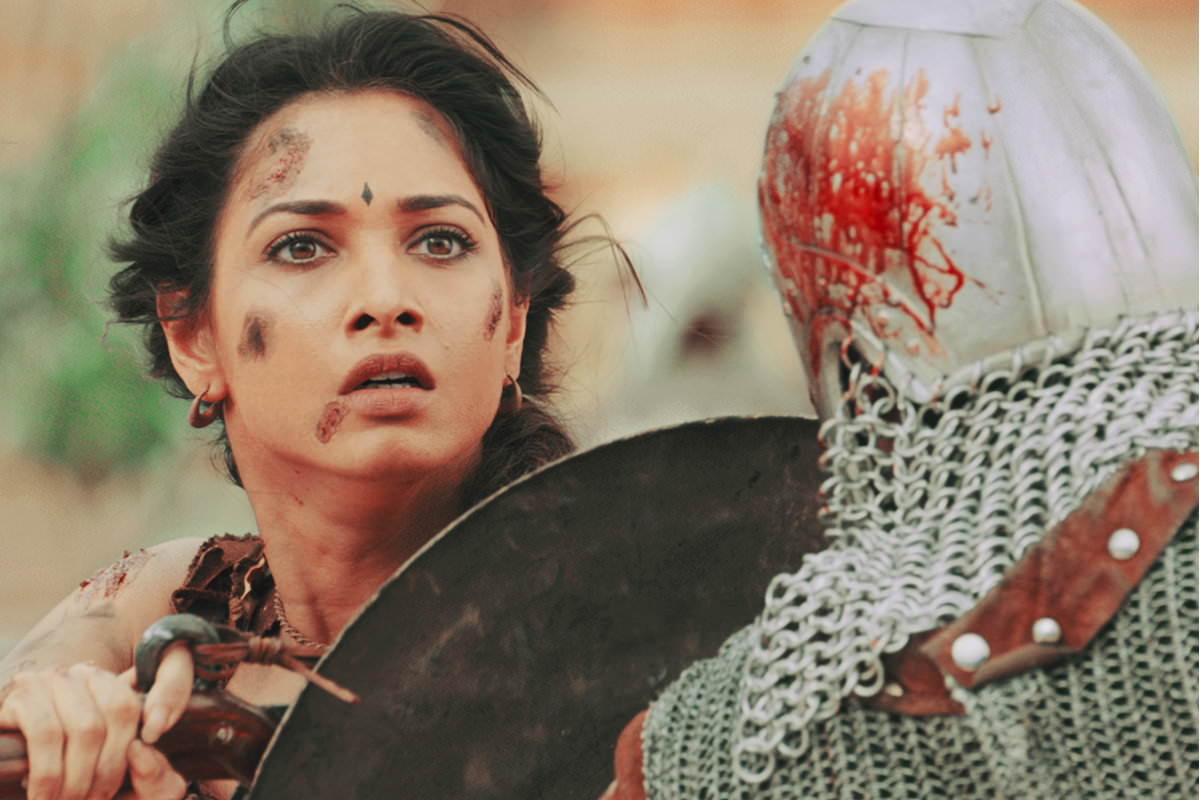 特曼娜芭蒂亞/Tamannaah Bhatia 飾演 阿凡提/Avanthika,馬亨德拉的老婆。(圖中持盾牌女性)