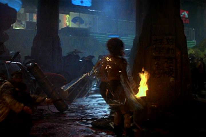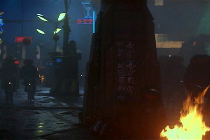 (c) 賽博龐克常見表現:陰暗(這部電影幾乎沒有幾個房間是有開燈的)、霓虹(路人都拿著像是光劍的雨傘、招牌)、充滿髒亂與潮濕感(多數場景都在雨天)