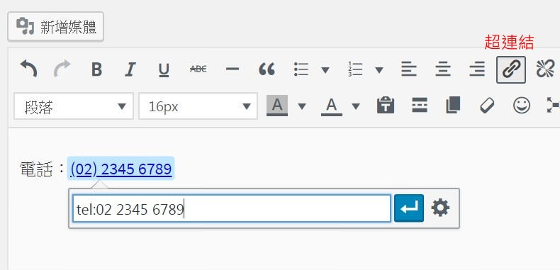 方法:在編輯超連結時,輸入「tel:電話號碼」即可。