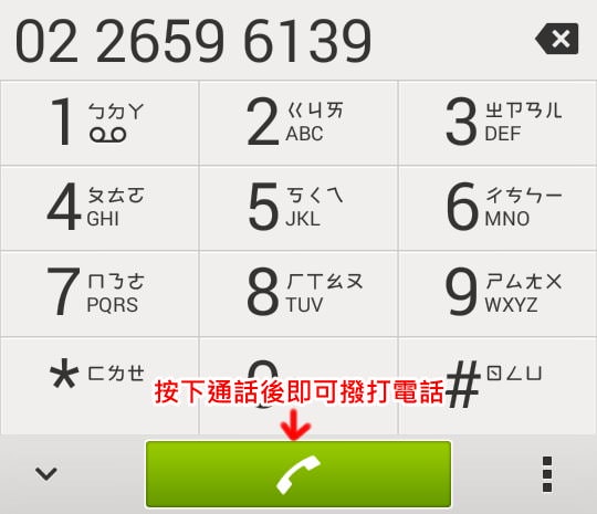 出現撥打電話的介面,且已經輸入好電話號碼,按下撥打電話即可撥號。
