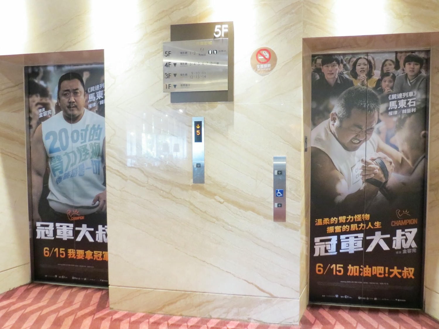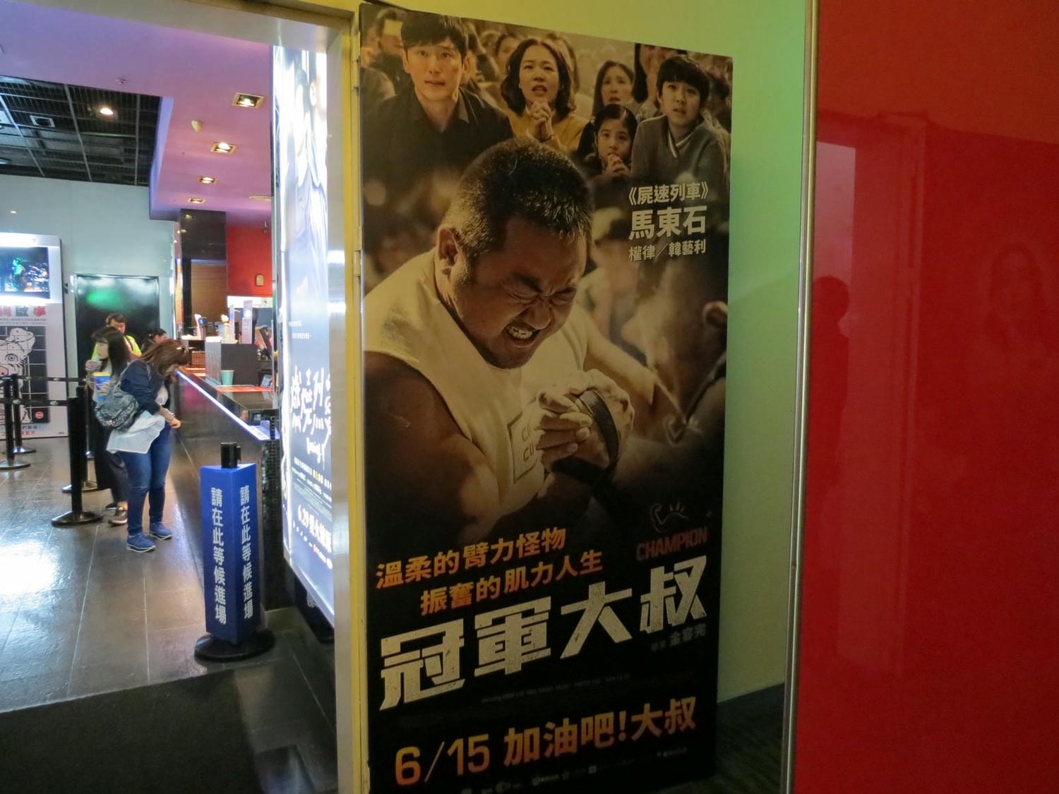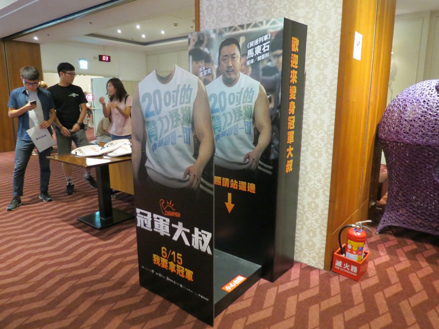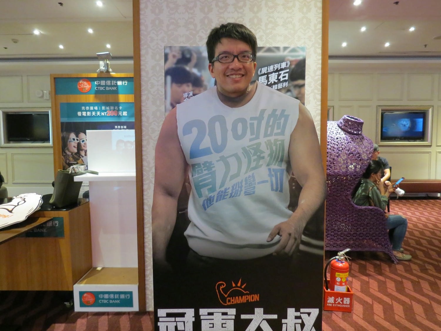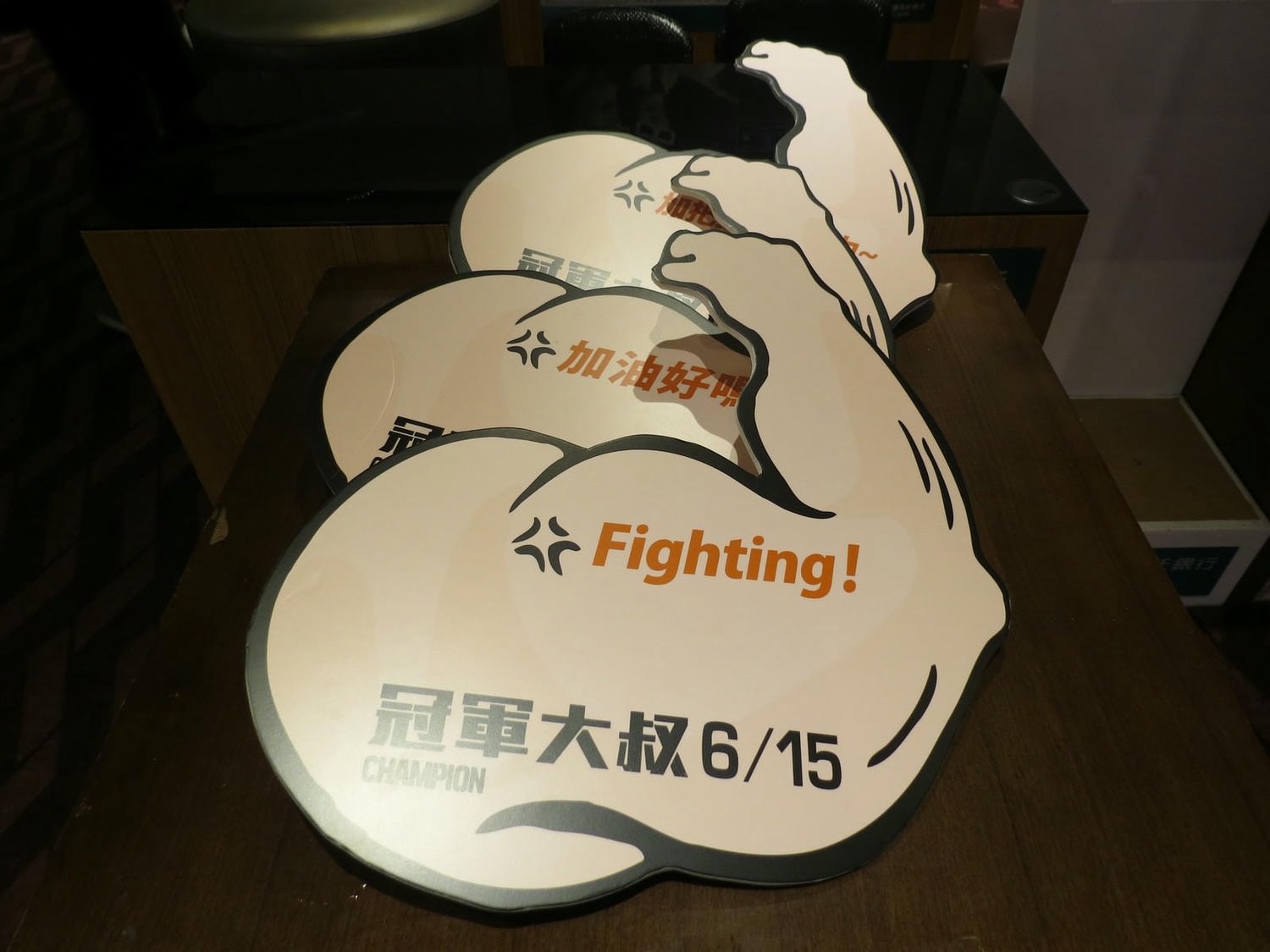 特映會提供的合照道具,巨大的肌肉手臂,上頭有各種 slogan:Fighting!、加油好嗎?、加把勁~出點力~等。