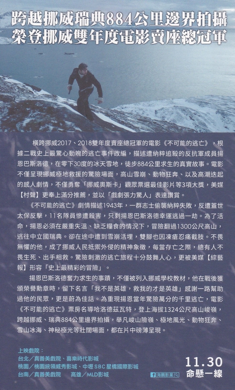二次大戰後期,挪威被德軍佔領,年輕的揚布斯洛與另外11人潛入挪威參與反納粹的任務。然而行動遭告發,德軍展開反擊僅揚倖存下來。身負重傷的他,不僅需穿過冰封海面、翻山越嶺,更要躲避德軍的全面搜索。他瀕死的邊緣時,完全是透過當地居民援助,每個人都冒生命危險幫助他逃過德軍耳目。