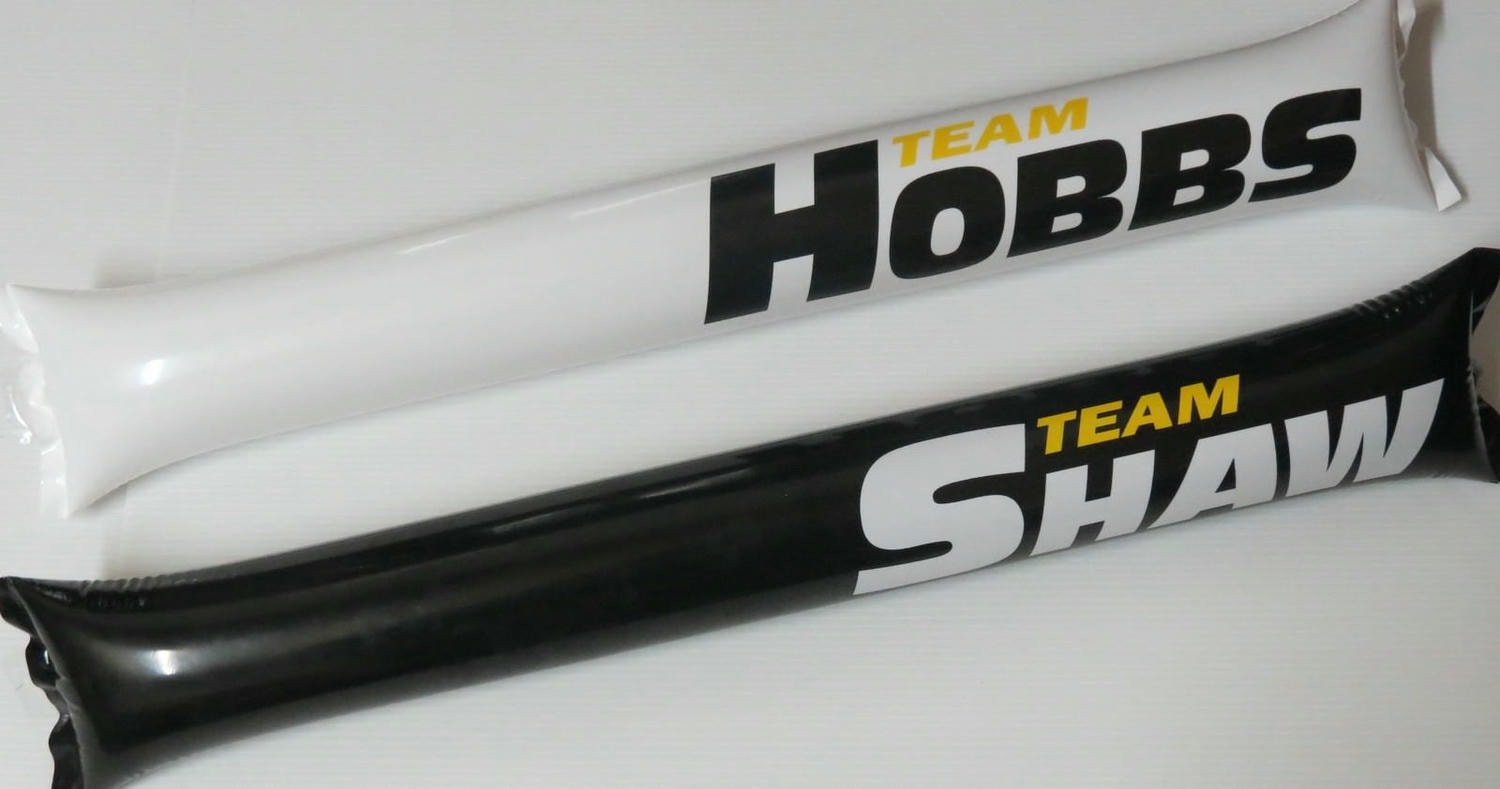場地會分兩側,一側全放「哈柏隊」(Team Hobbs)的加油棒,因為他是白道(美國外交安全處探員),所以加油棒是白色的。另一側是放「蕭隊」(Team Shaw)的加油棒,而他是犯罪集團分子,所以是黑色加油棒。看你手環是哪一隊,就會被引領到該陣營的座位上去,還蠻有趣的。