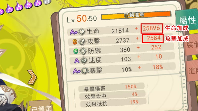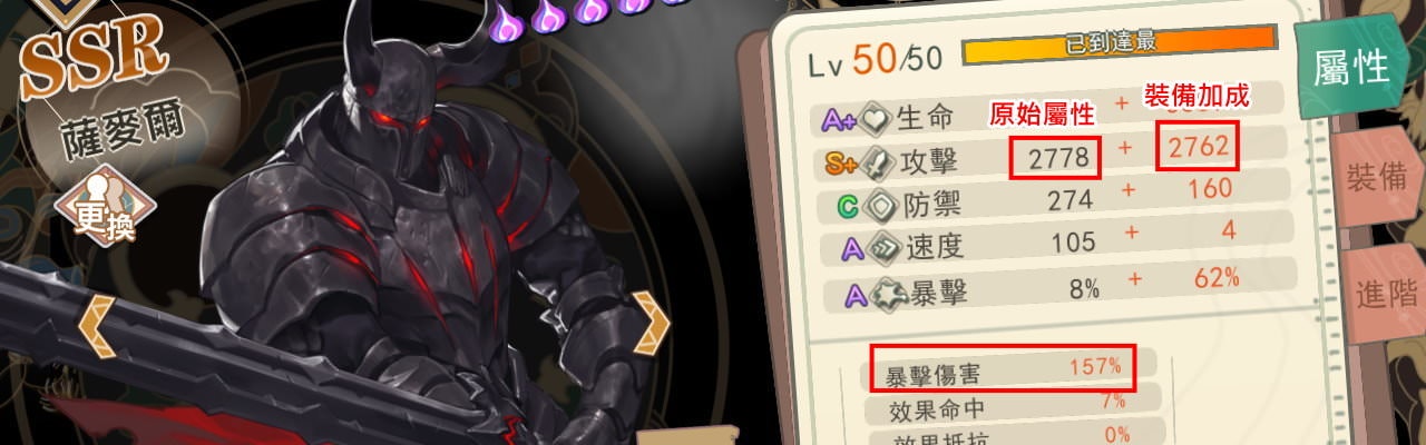 像上圖薩麥爾的「攻擊」就是 2778 + 2762 = 5540,而「暴擊」是 5540 x 157% = 8679.8