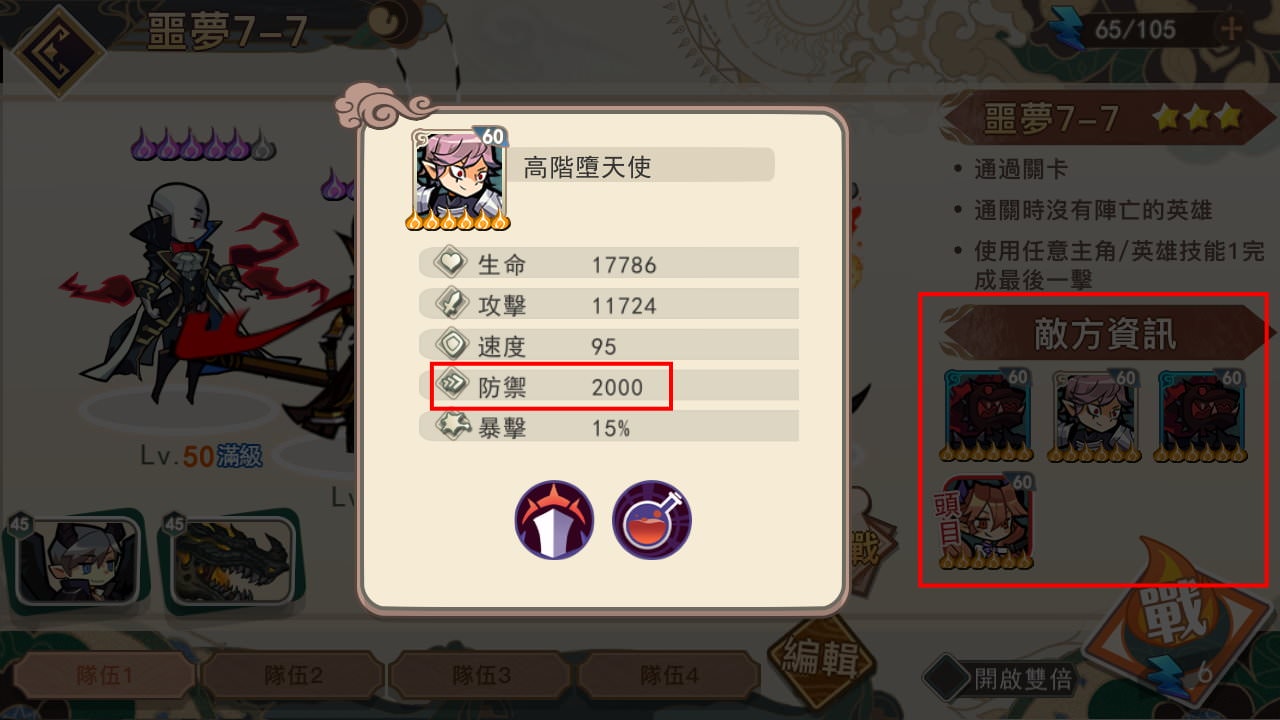 打關卡時,點「敵方資訊」就可以看到敵方的能力值,這遊戲絕大部分的敵人防禦力都是固定的,包括劇情、降妖除魔、進階試煉、巴別塔、仙境福利、尋訪古神,不管是BOSS還是小兵,難易度是普通、困難還是噩夢,敵人的防禦力固定都是「2,000」。