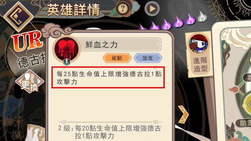 這邊要探討的是德古拉在「進階」後所擁有的技能「鮮血之力」:每25點生命上限值增加德古拉1點攻擊力。