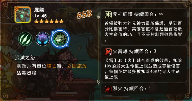 但是屍龍有招被動技能「泯滅之怨」讓人相當頭疼,只要敵方有單位陣亡,就會立即施放猛毒烈焰。也就是玩家在打屍龍時,只要主角/護法/英雄有1人陣亡,屍龍就會再度攻擊,簡單來說就是只要陣亡1位,就等著被全滅。(這招其實跟范無救的「業力斬」差不多,但屍龍攻擊太高)