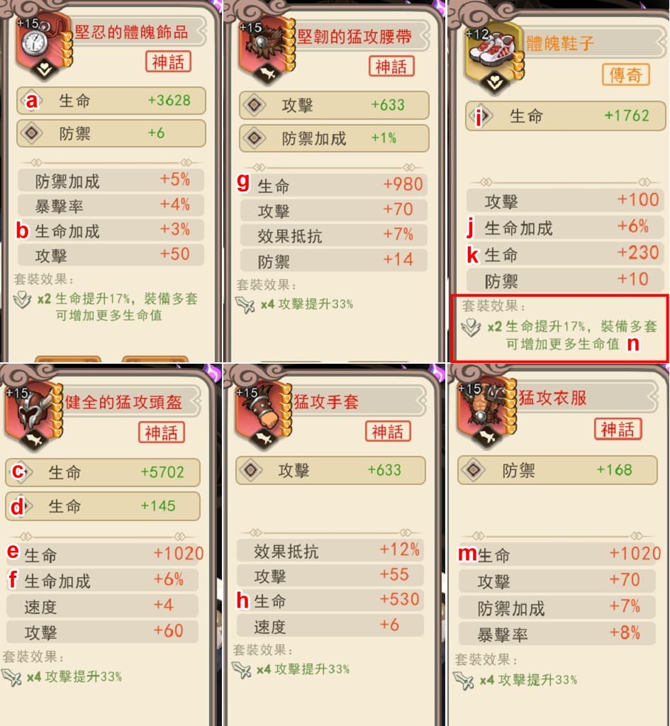 有幾組套裝是增加「百分比」的,像「猛攻」是攻擊+33%、「體魄」是血量+17%。