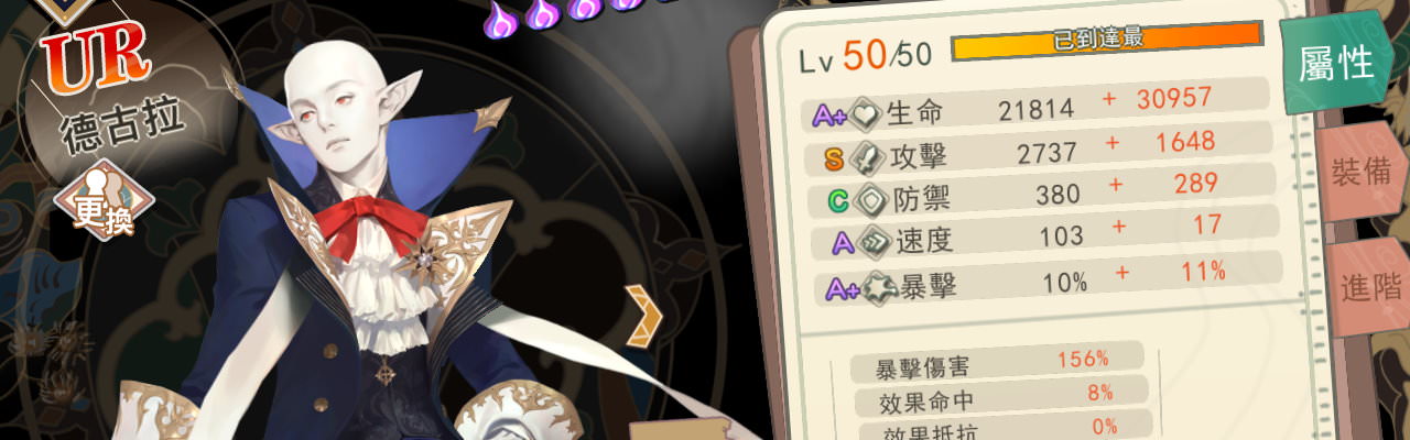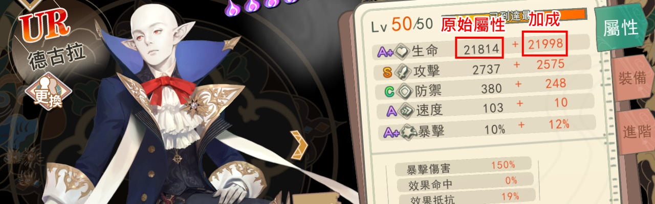 這是我其中一位英雄「德古拉」的屬性,我以「生命」部份來做介紹,「原始屬性」是固定的,德古拉、進階、50級滿級,就是 21,814。後面是「裝備加成」的部份。