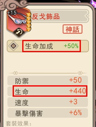 裝備的「生命」、「攻擊」、「防禦」的加成有2種,一種是直接加成數值,像生命+440,一種是直接加成百分比,像生命加成+50%。