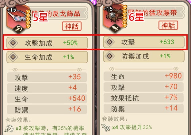 附註:我尚打不到6星裝備,現有的6星裝是開服(或創號?)登入獎勵,全是「攻擊」,故我只能用5星來舉例,6星的「攻擊加成」會更高。