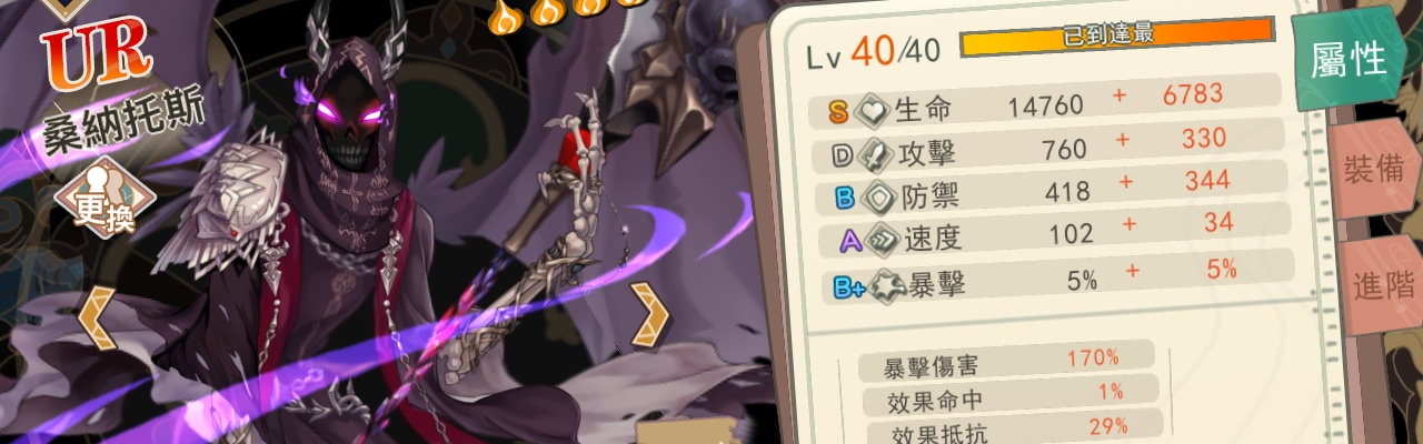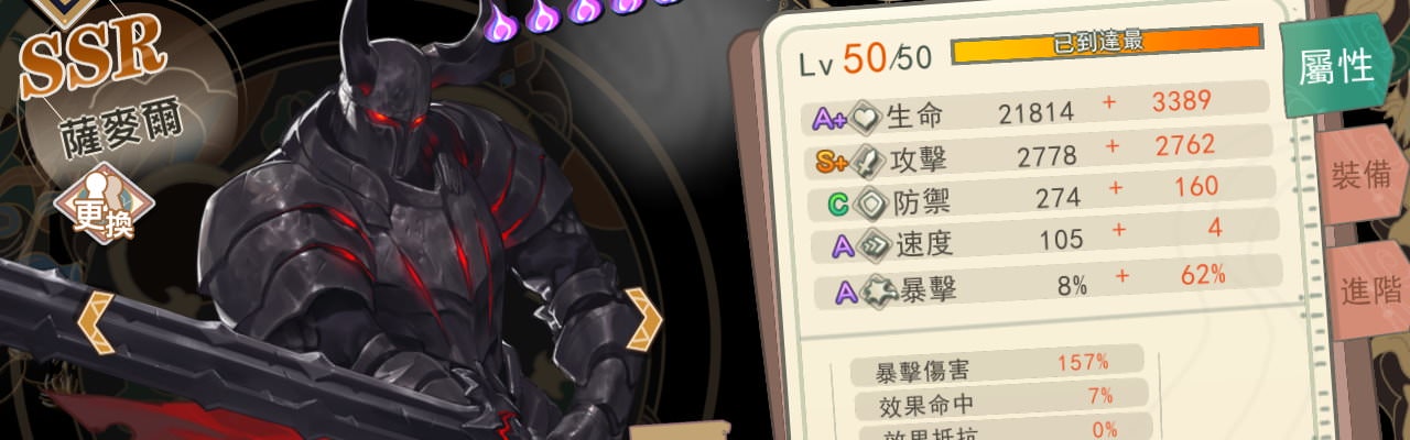 也不一定要到「UR」英雄才有如此高的攻擊力,像「SSR」的薩麥爾,攻擊是「S+」級,50級滿級/進階,攻擊比孫悟空還高一些些,有 2,778。