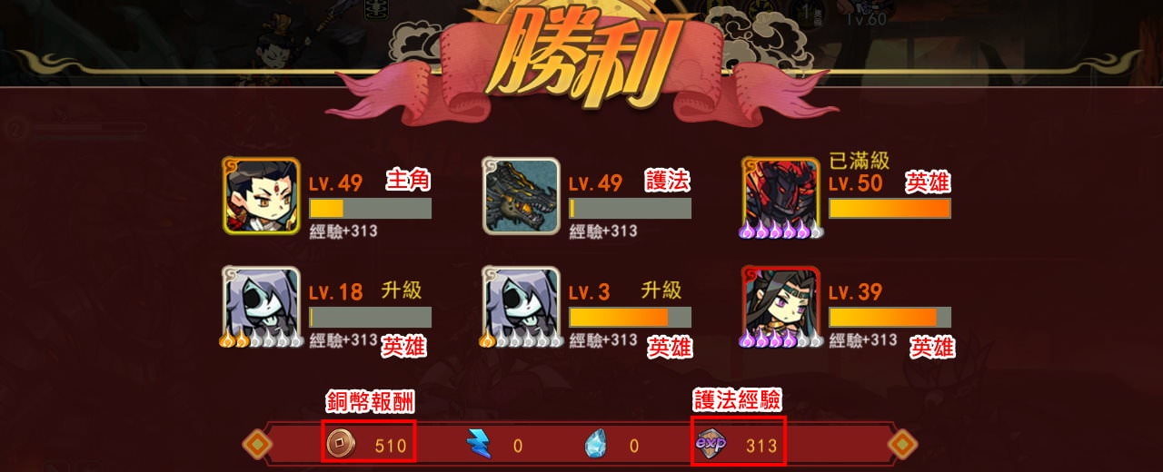 遊戲中最主要經驗取得管道是打各種關卡,獲勝時,有上場的角色全部都能得到相同的經驗值,包括主角、護法、英雄,此外還能拿到同數值的「護法經驗」(下方報酬欄位右側),這在底下護法部份還會提到。