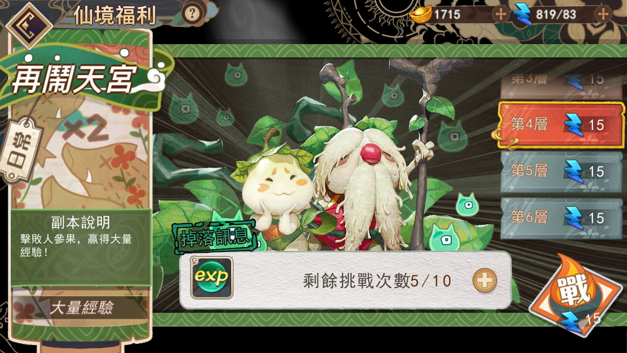 雖然說除了「天庭寶藏」以外的關卡幾乎都能賺到經驗,但一般要重複刷關卡賺經驗還是會選「劇情」,其他關卡太消耗能量、經驗報酬又少,主要是為了打特定的材料。
