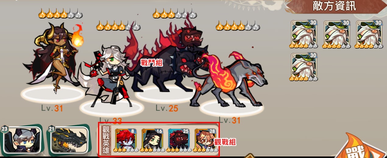 再鬧天宮比較特別的是它可以安排「觀戰英雄」,觀戰組不用上場也能獲得1/2的經驗。