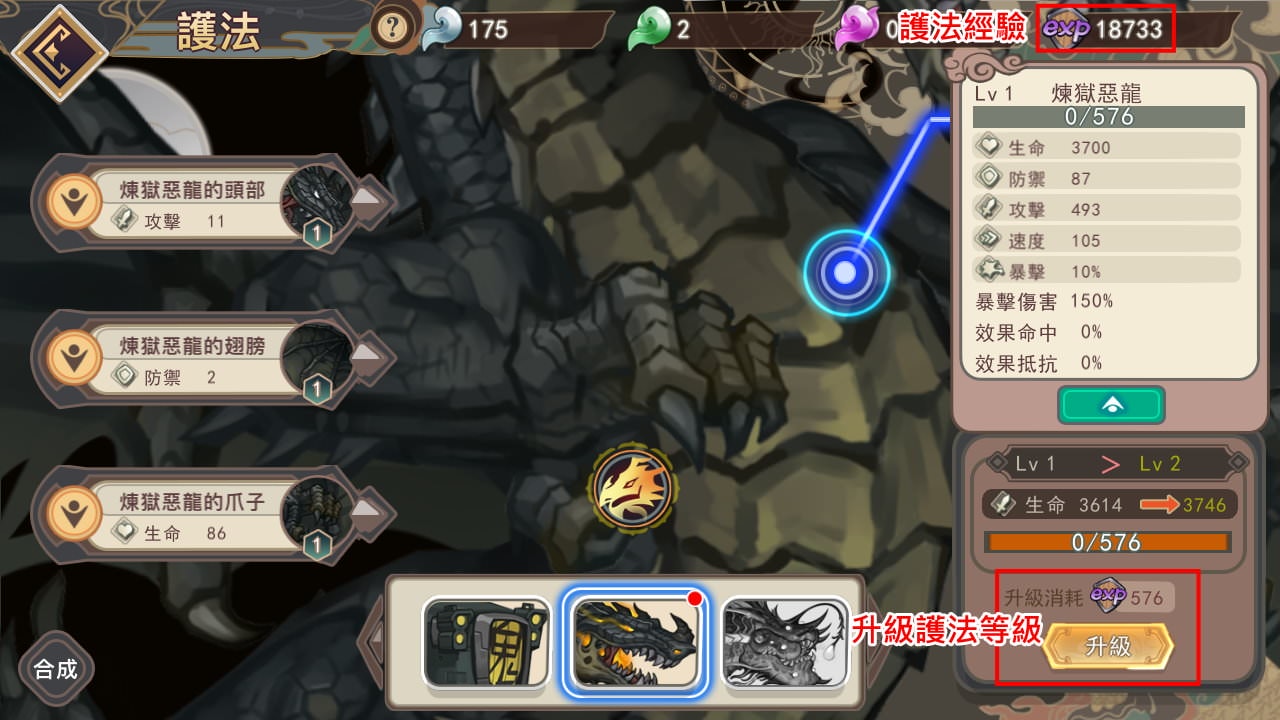 譬如說可以用「惡鬼號」去打關卡,但是把經驗都加在「煉獄惡龍」身上,這樣在切換護法時,兩隻護法都有一定的等級;也可以把經驗加在同隻護法,專精先練一隻。