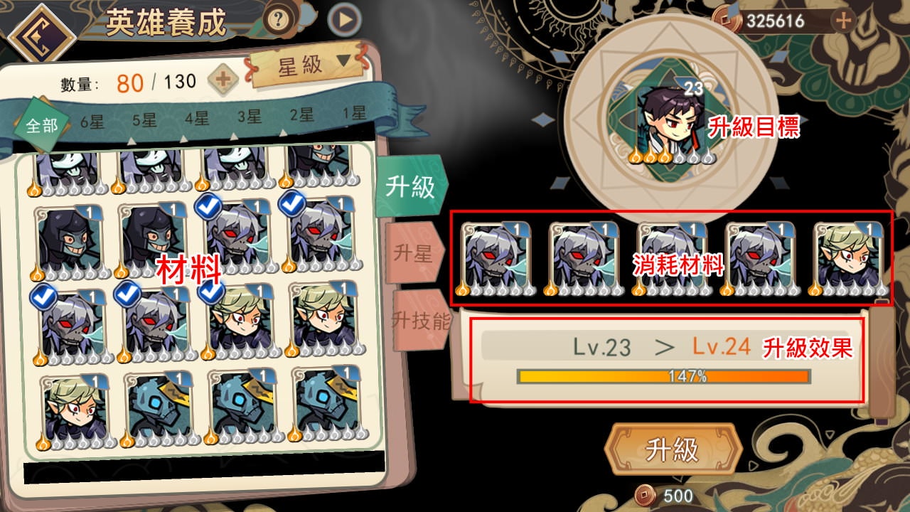 除了打關卡外,英雄還能靠消耗其他英雄來升級,這在遊戲中叫做「英雄養成」。