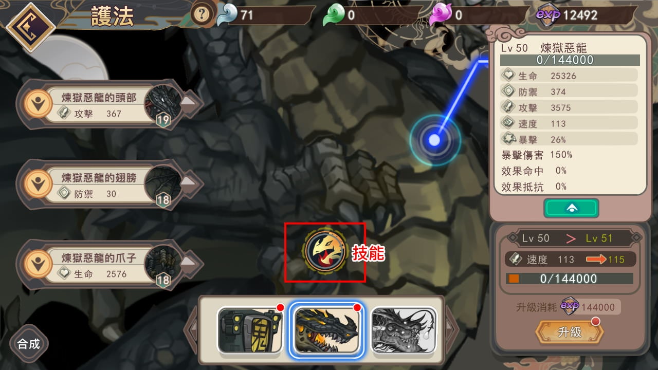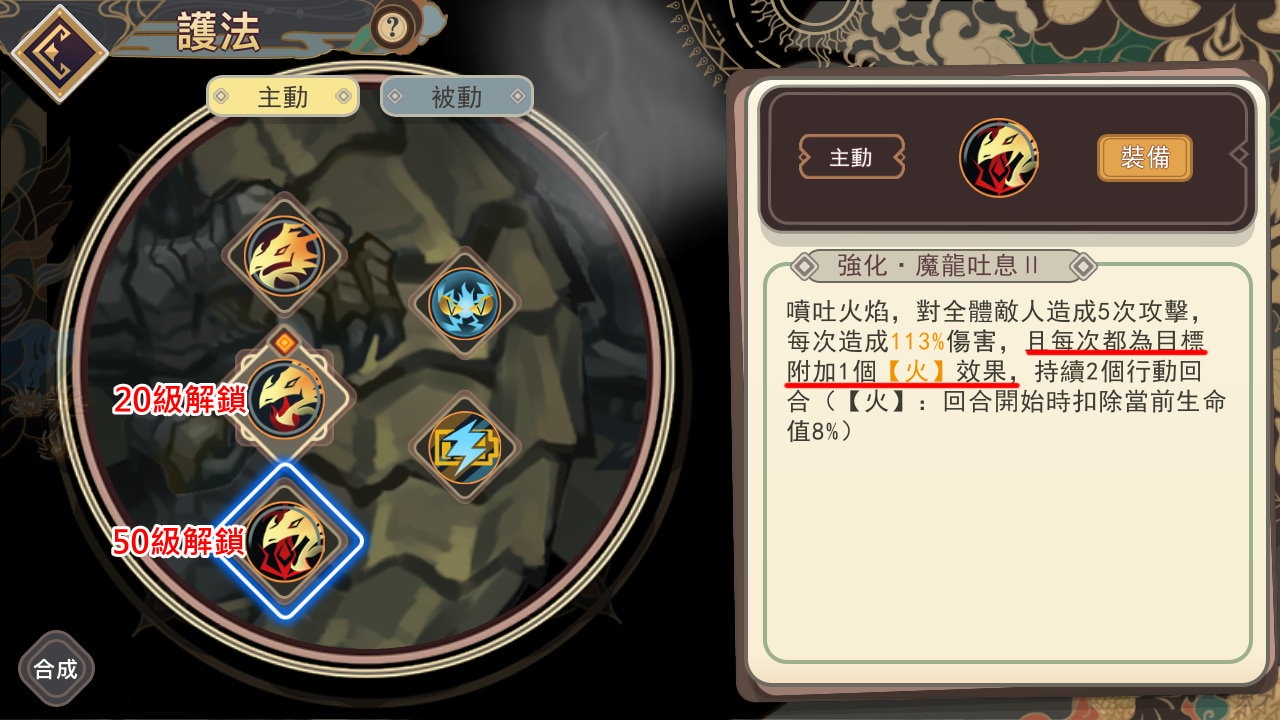 像煉獄惡龍20級/50級的技能都是攻擊時附加火效果,護法技能跟英雄技能不一樣之處在於,沒有命中率(效果命中)問題,攻擊時一定會附加效果,就連打BOSS也一樣。