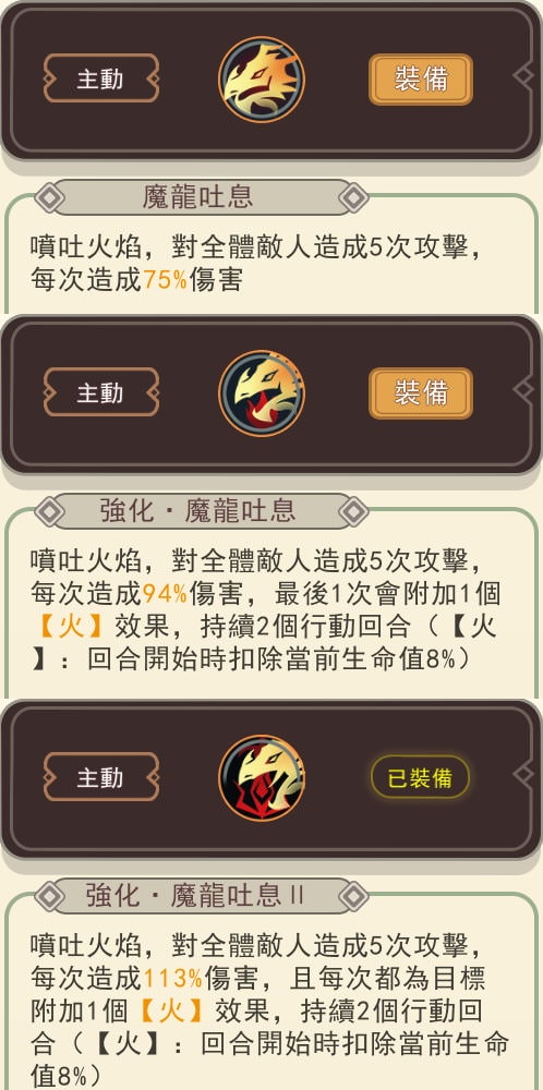 | 強化.魔龍吐息 II | 5次攻擊,群攻,每次113%傷害,每次攻擊都附加1個「火」效果,持續2回合 |