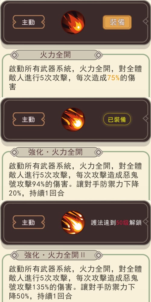 | 強化.火力全開 | 5次攻擊,群攻,每次94%傷害。防禦下降20%,持續1回合。 |