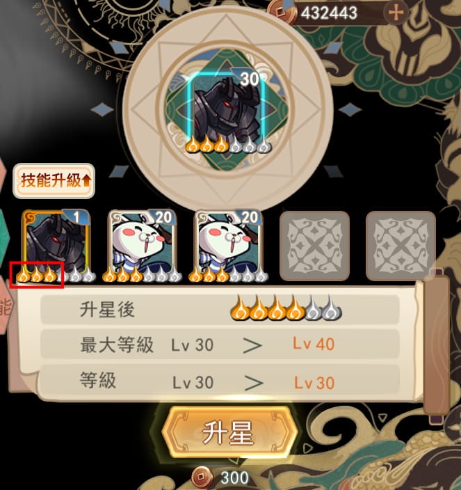 說明:不用刻意點「升技能」頁籤,就算是在「升級」或「升星」頁籤,只要有放入相同的英雄,就會同時提昇英雄技能。