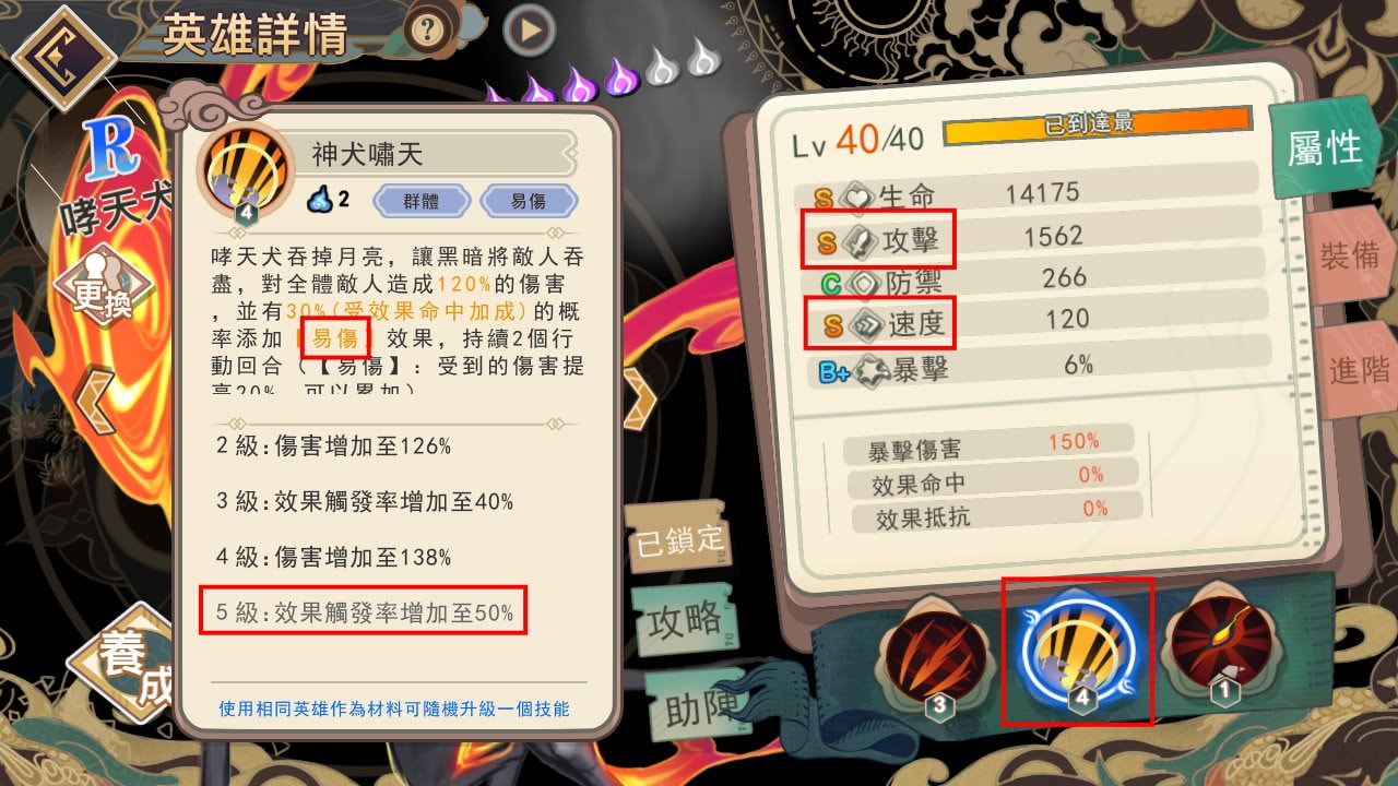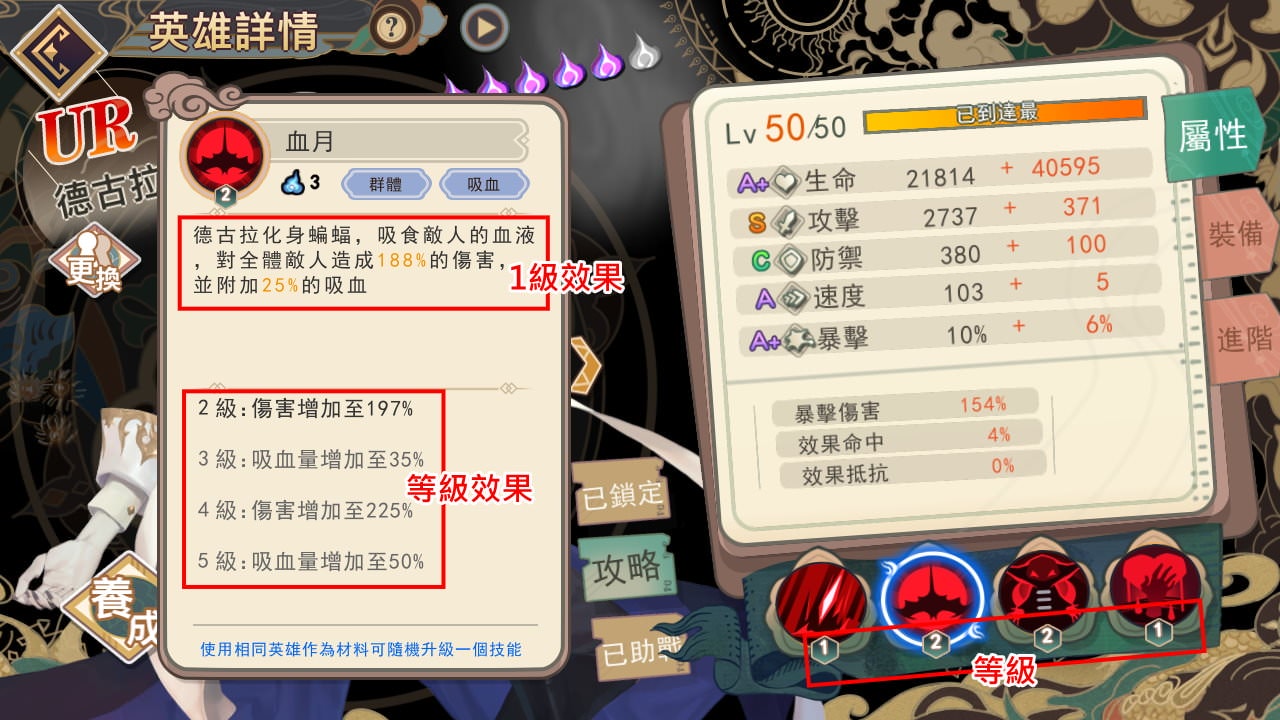 像SR英雄因為非常容易重複抽到,很容易快速把所有技能都升滿。像昂日星君只有3個技能,第1招有5級、第2招有1級、第3招(進階技能)有3級,只要抽到7張一樣的,用6張當材料,就能把技能升滿。