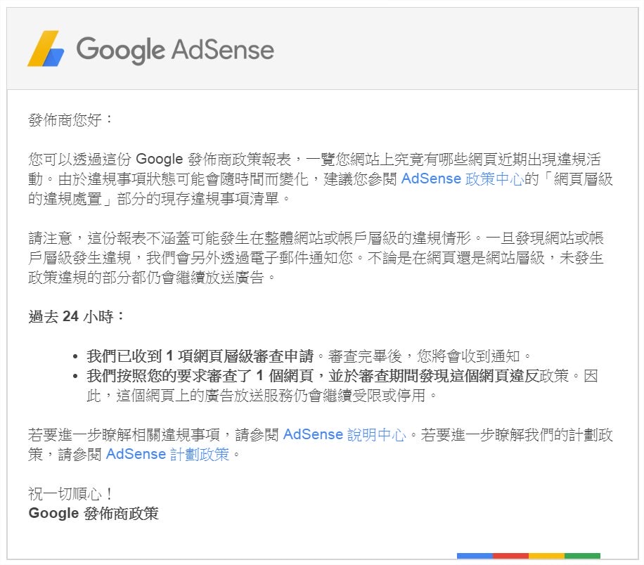 但n天後又有讀者去點那篇文章,這時 Google 又收到在該網頁投放廣告的要求,它又會再度通知你這網頁違規了。