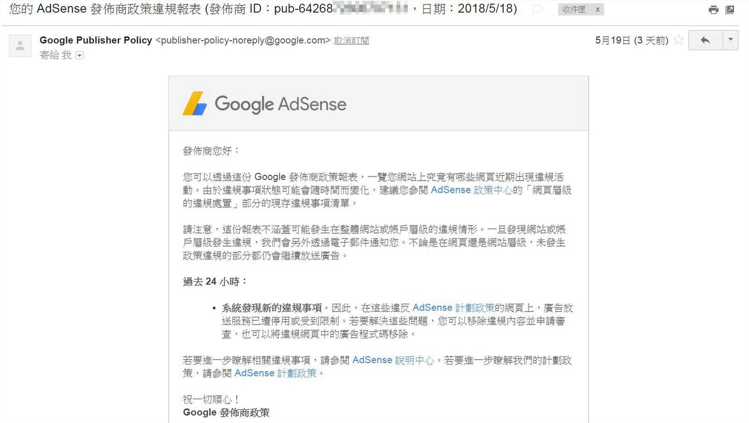 1, 若有違規時,廣告管理員帳號會先在 E-mail 收到標題為「您的 AdSense 發佈商政策違規報表」的信件通知,這封信無法直接看到內容。