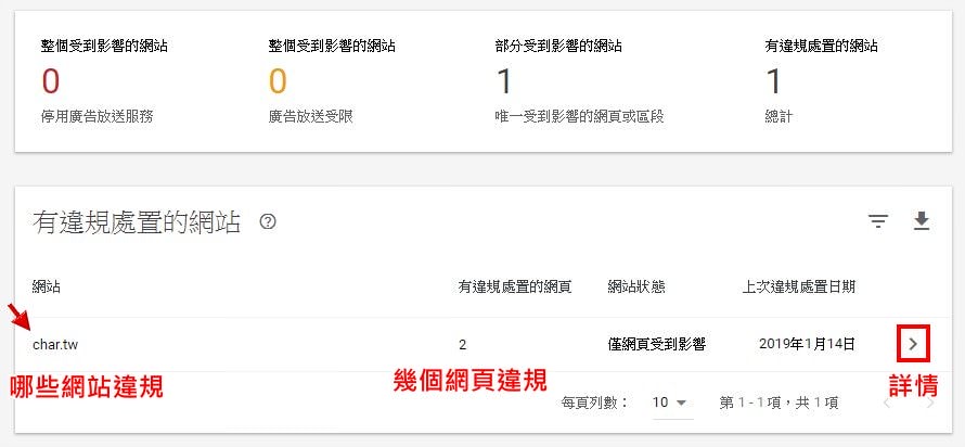 一個帳號可以放在N個網站上放廣告,右下角區塊則是會秀出你有哪些網站違規、有幾個網頁違規等資訊,點擊違規網站後可看到詳細資料。