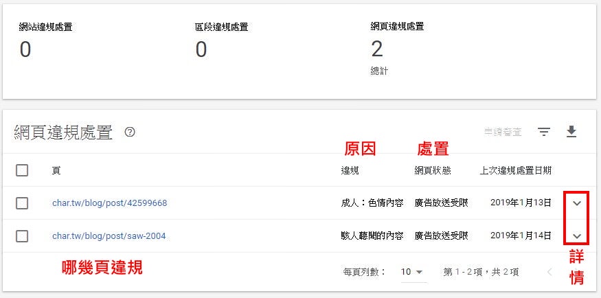 3, 點違規網站進來後,可以看到你那個網頁違規、違反什麼規定、處置辦法。點向下箭頭則是可以查看詳細資料。