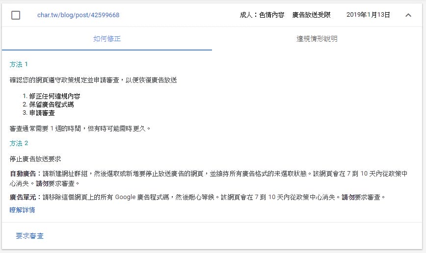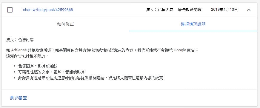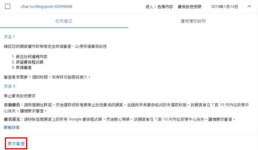 如果你還是想要在該頁出現廣告,就必須先把認為違規的內容拿掉,然後提出申請審查。