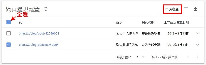 也可以在這界面,勾選你已處理好的網頁,若是全部處理好,也可以點全選,然後點右上角申請審查。