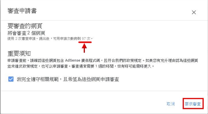送出審查時的確認畫面,勾選遵守規範後,再次點右下角要求審查即可。