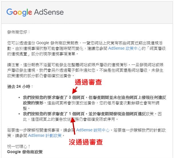 如果有部份沒有通過或全部沒有通過,就要再次到 Google AdSense 登入帳號,點:帳戶 > 政策中心,去看是哪幾則沒過,再次調整文章內容。