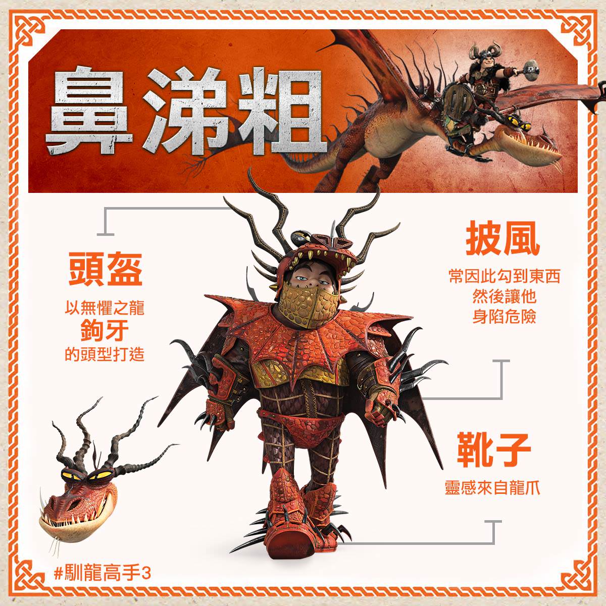 鼻涕粗·約葛森/Snotlout Jorgenson,個性驕傲不服輸的龍騎士,自認是族群裡第二把交椅,積極想獲得娃卡關注,由 喬納·希爾/Jonah Hill 配音。