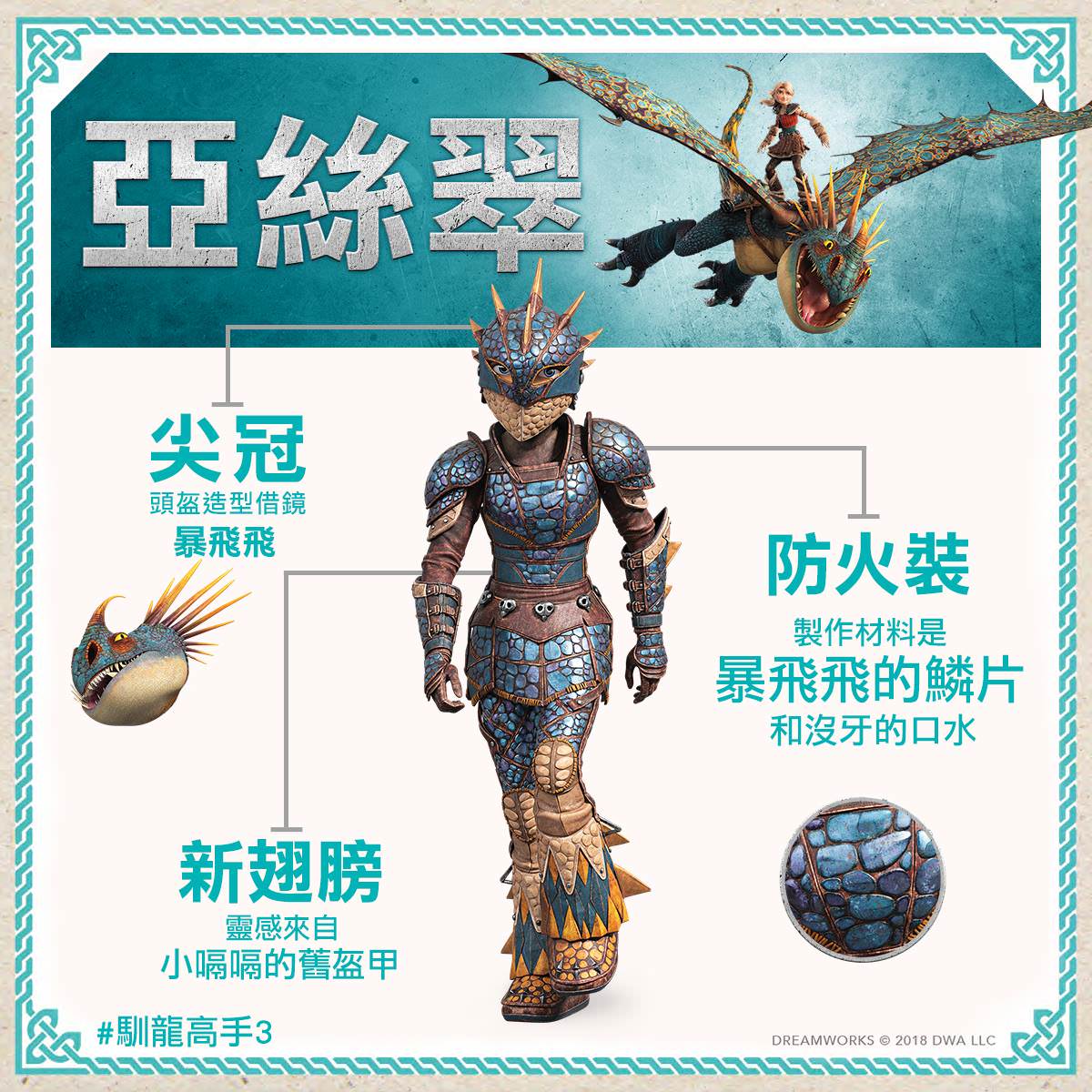 亞絲翠的坐騎是暴飛飛(Stormfly),品種為致命納得(Deadly Nadder),原本膚色為藍色,飛到龍之國度後變成螢光色。