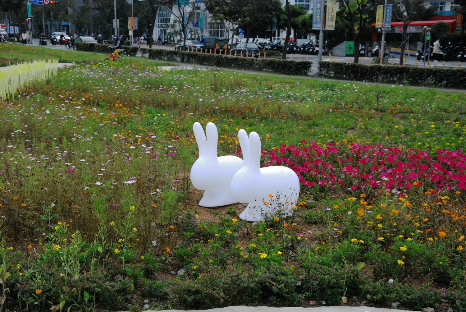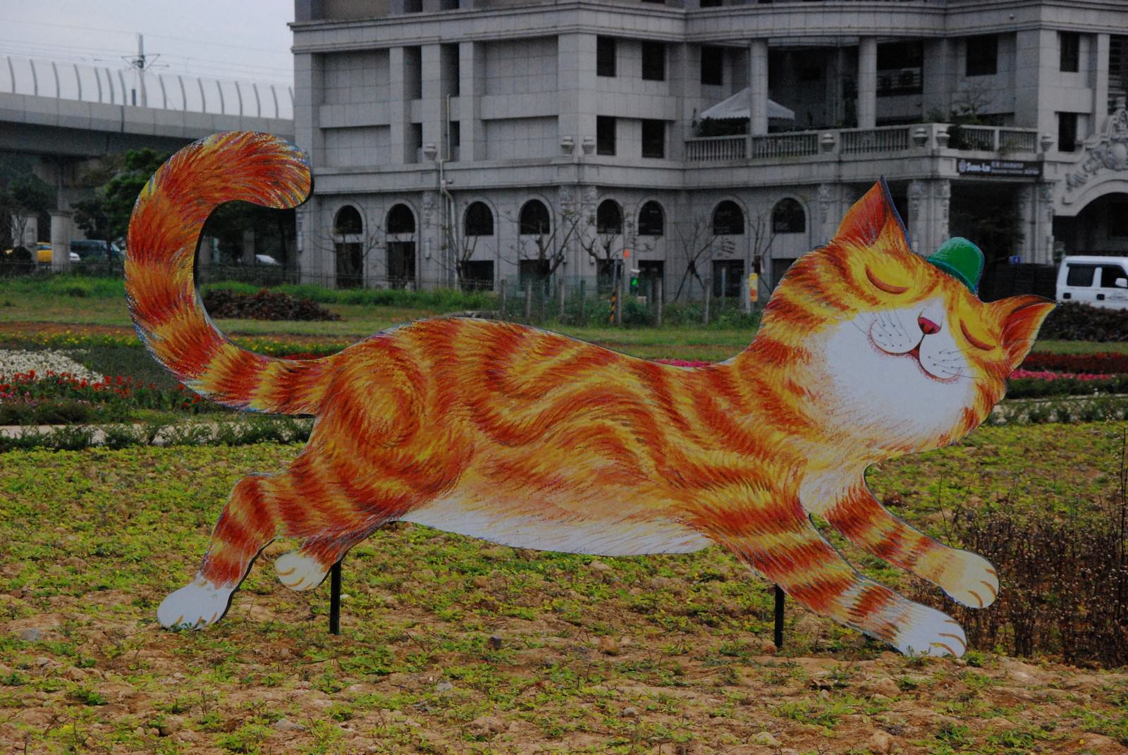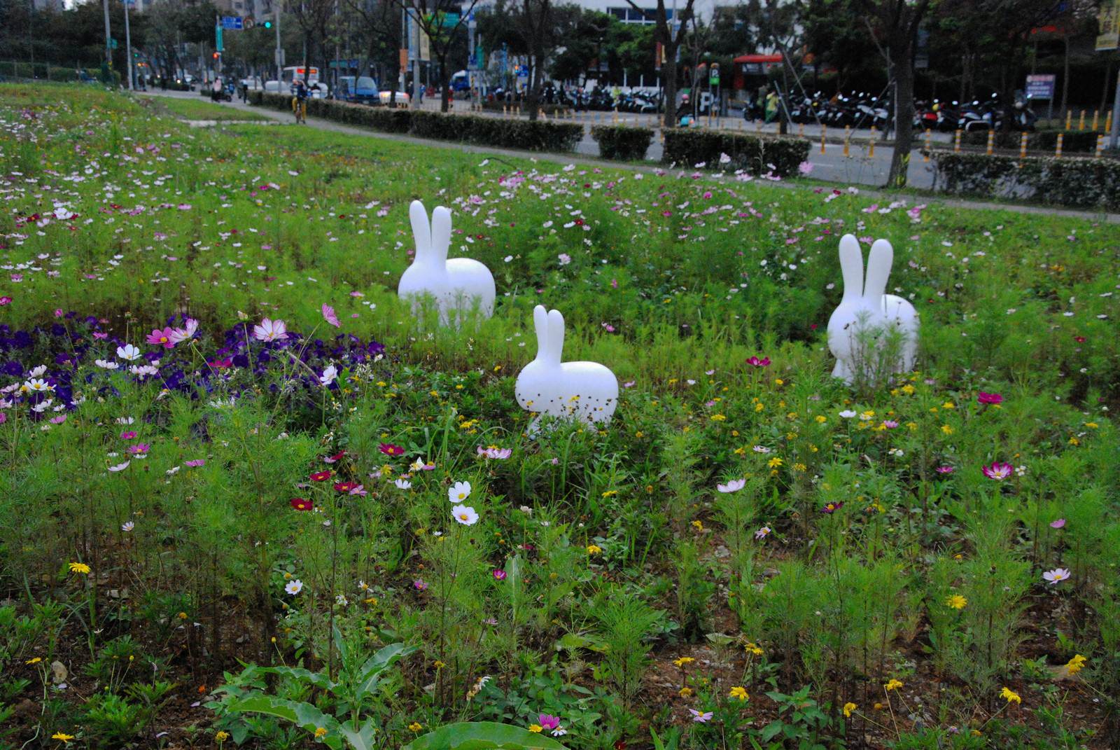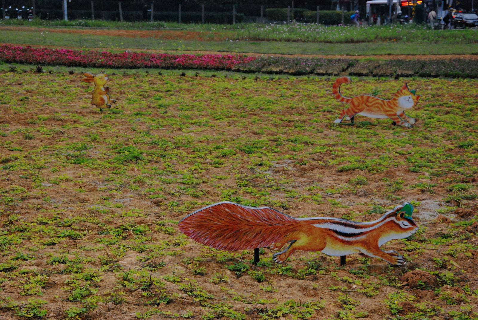 草地中的動物看板,這些可愛動物也可以在各站指示牌、塑像中看到。