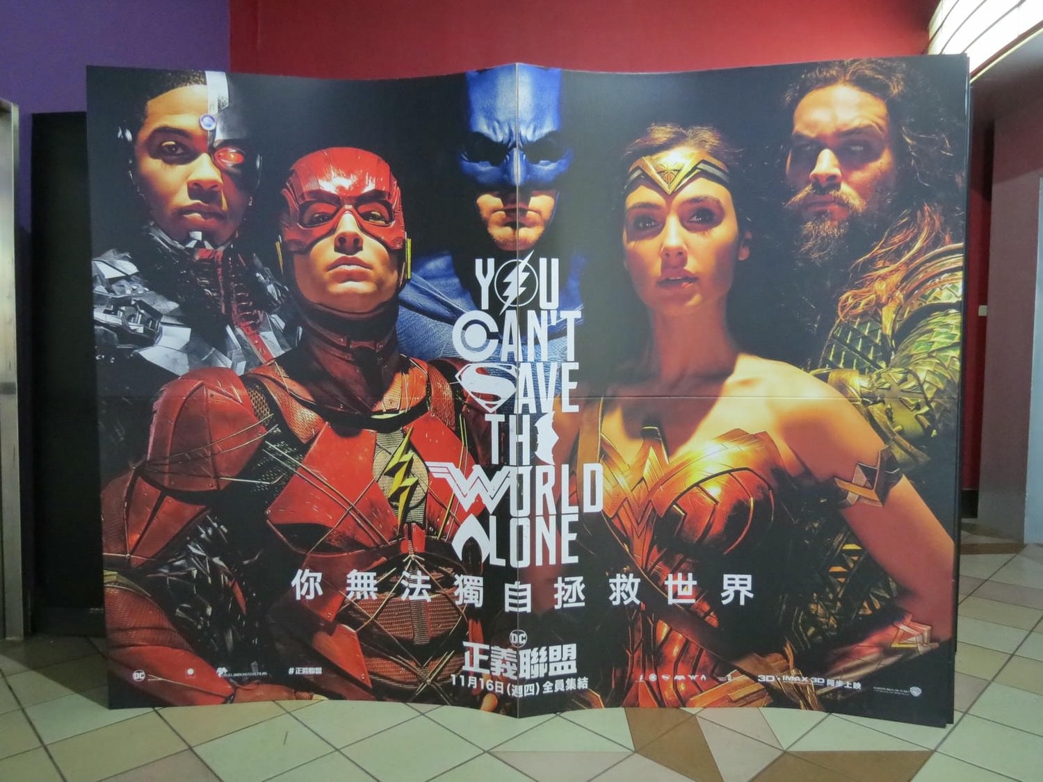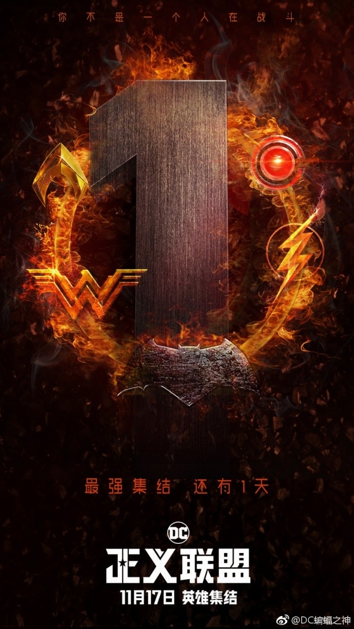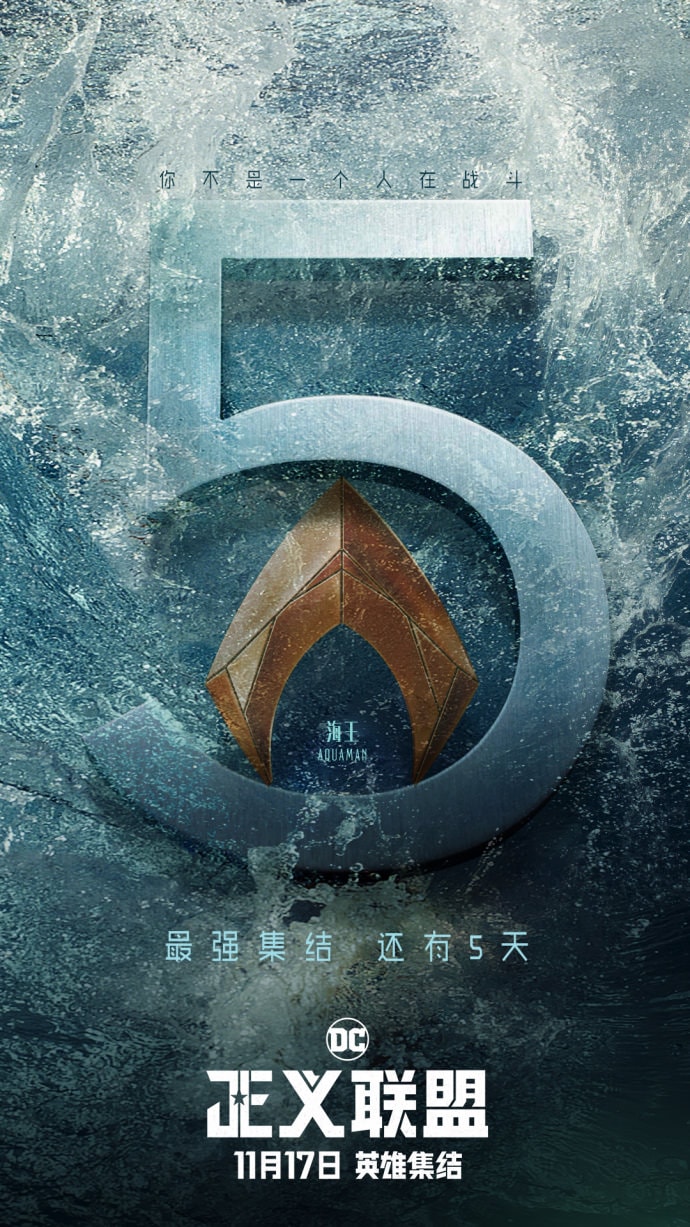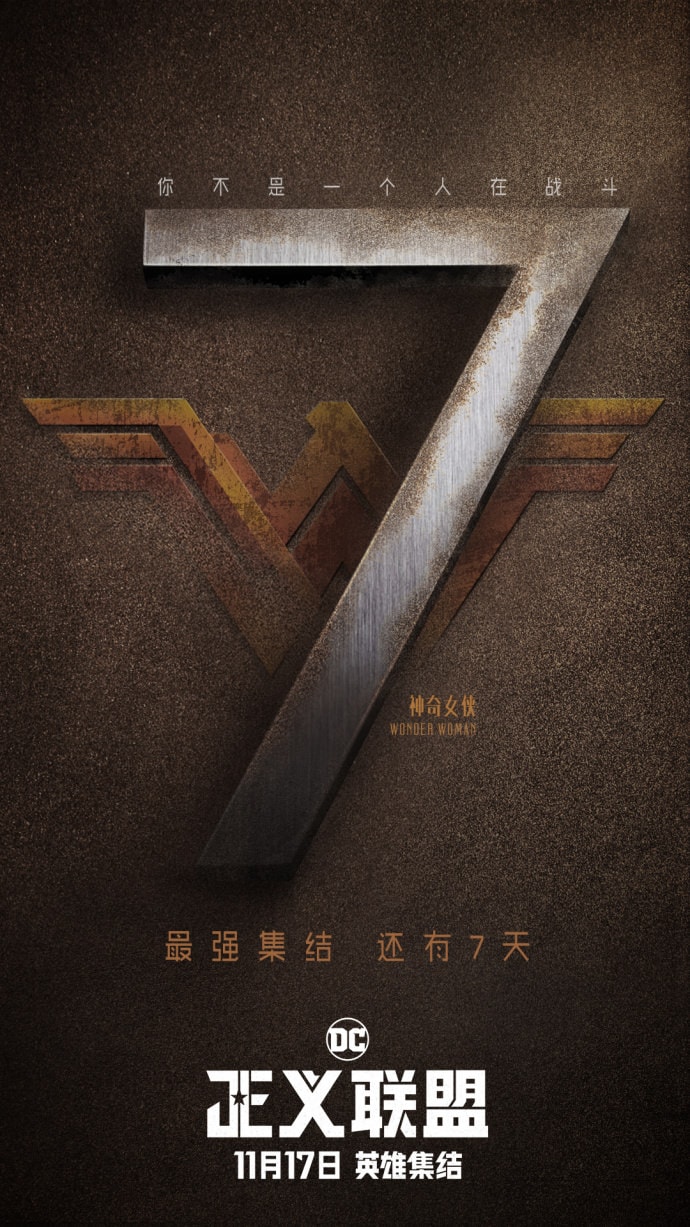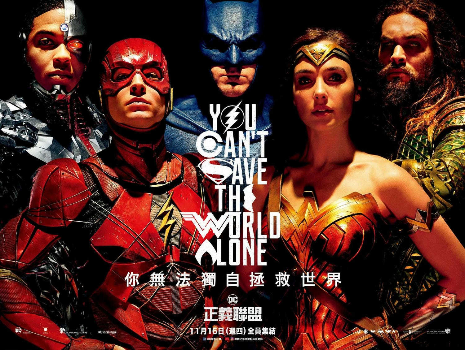 1, 我還蠻喜歡海報上 “You Can’t Save The World Alone” 這句 slogan 包含所有英雄符號的設計,由上而下依序是:閃電俠(O)、鋼骨(C)、超人(S)、蝙蝠俠(E)、神力女超人(W)、水行俠(A)